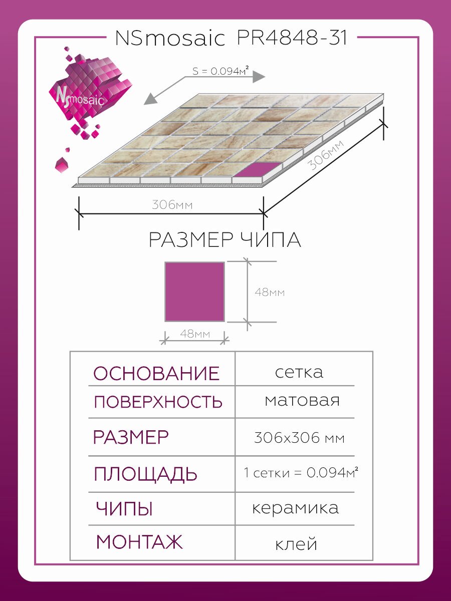 Мозаика керамическая NS mosaic PR4848-31 306х306 чип 48х48 уп 5 шт интересное: