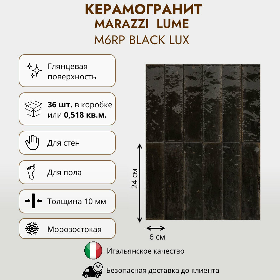 Купить Керамогранит MARAZZI LUME Black Lux M6RP, 6x24 см, черный , глянцевый