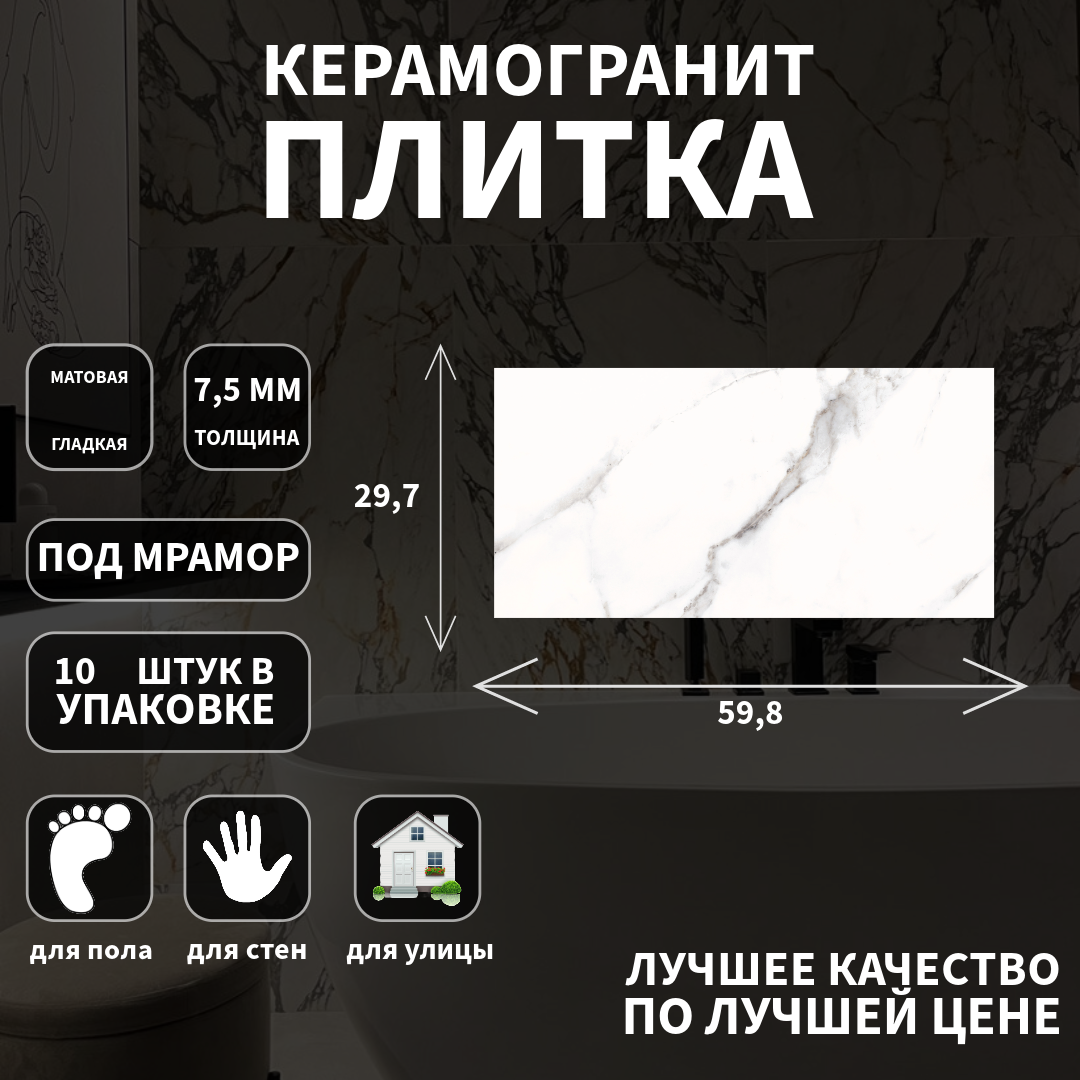 Керамогранитная плитка Cersanit, коллекция: Lorenzo белый, эффект: мрамор, поверхность: матовый, 29,7х59,8х0.75 интересное: