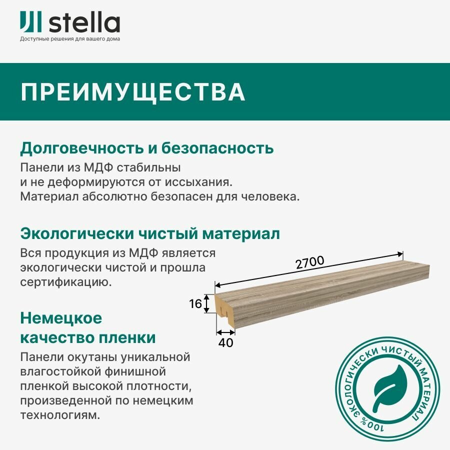 Stella Рейка интерьерная МДФ декоративная, как деревянная; для стен, зонирования комнаты, детской, потолка, для перегородки или ниши; Форма Бриона Цвет Дуб Сонома 2700*40*16 мм (упаковка 8 штук)