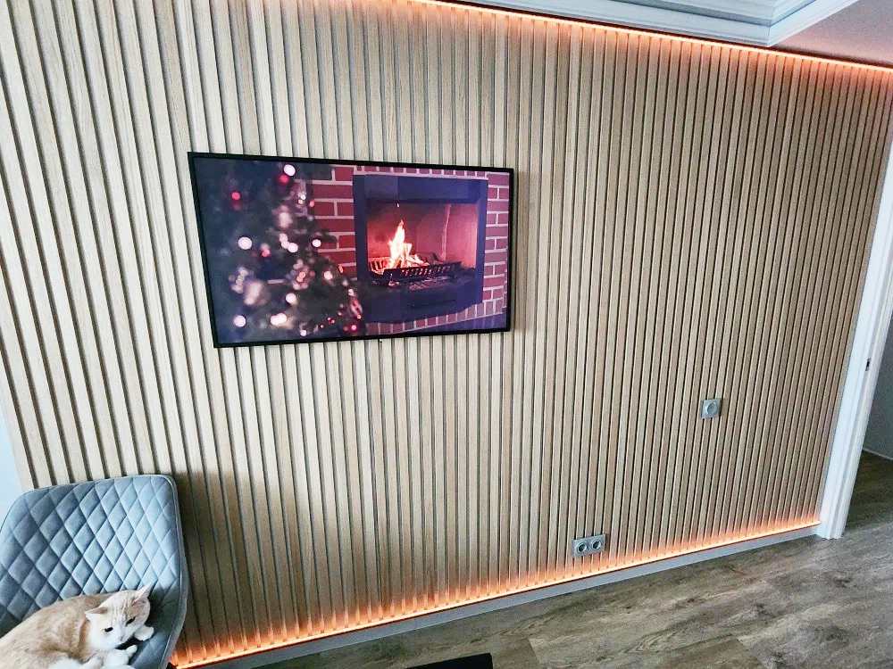 Акупанель (Акустическая стеновая панель): декоративные рейки – Дуб шпон и Белая акустическая панель
