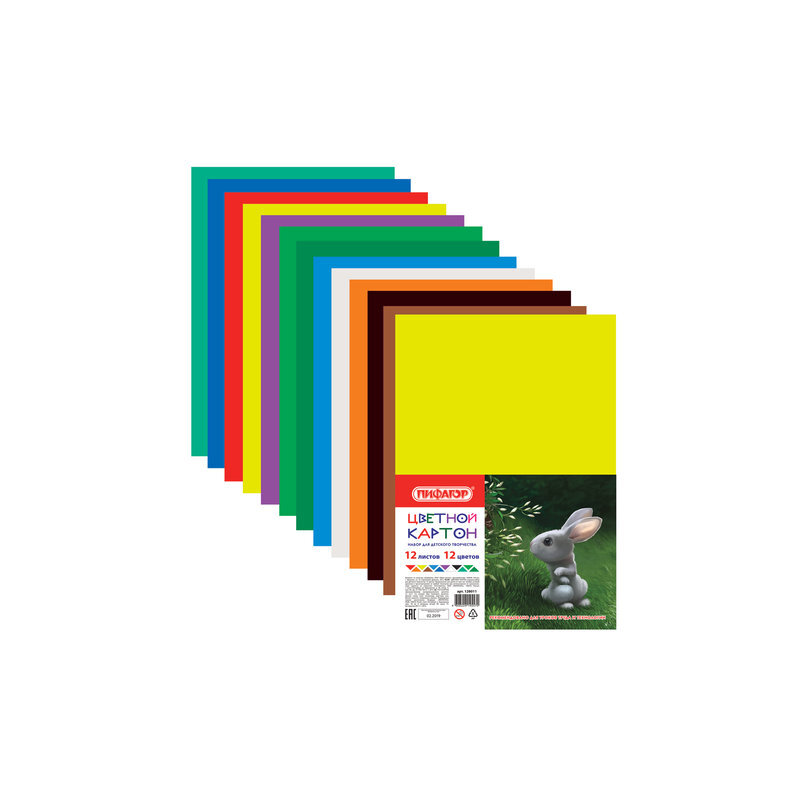 Картон цветной немелованный Пифагор (12 листов, 12 цветов, А4, 200х283мм) (128011), 22 уп.