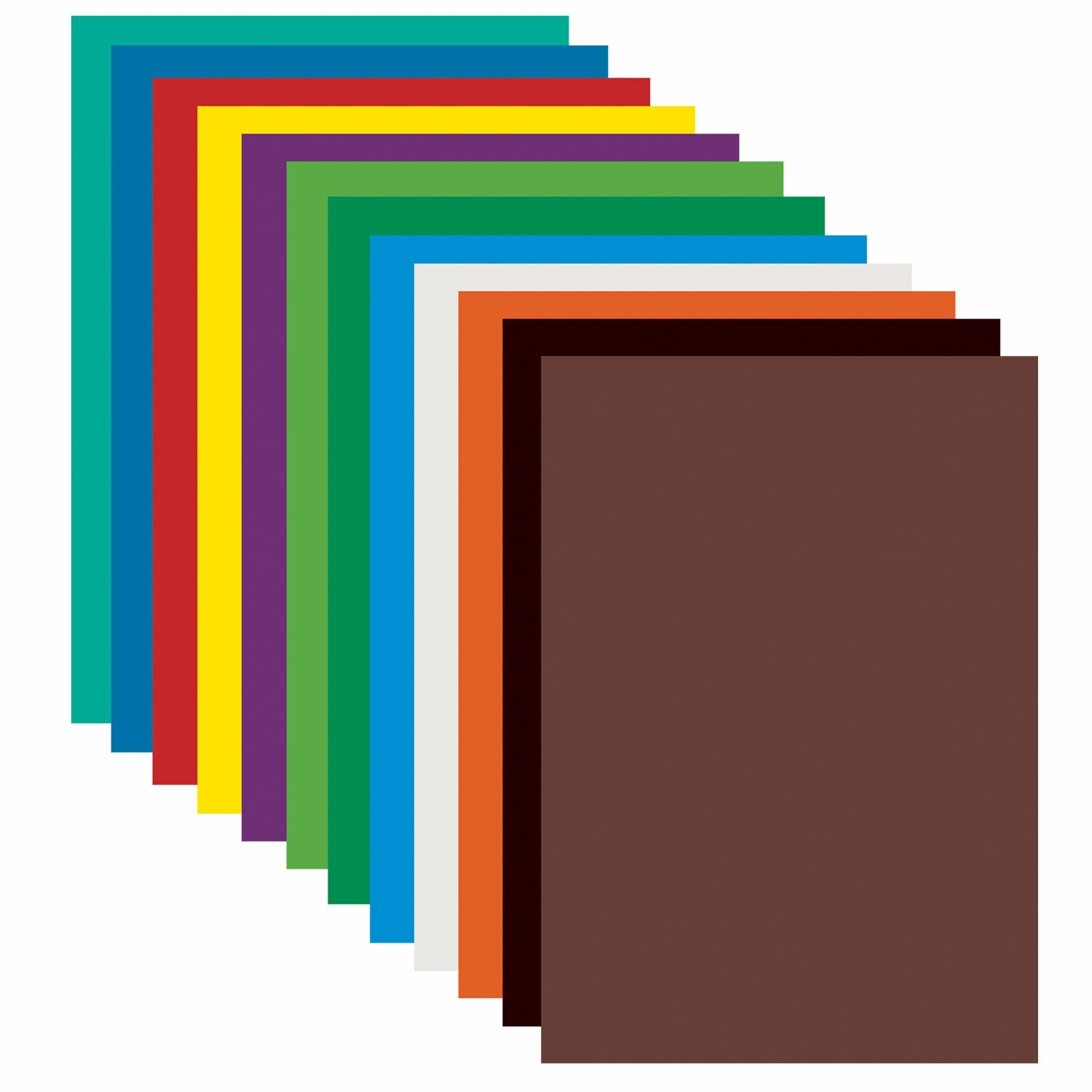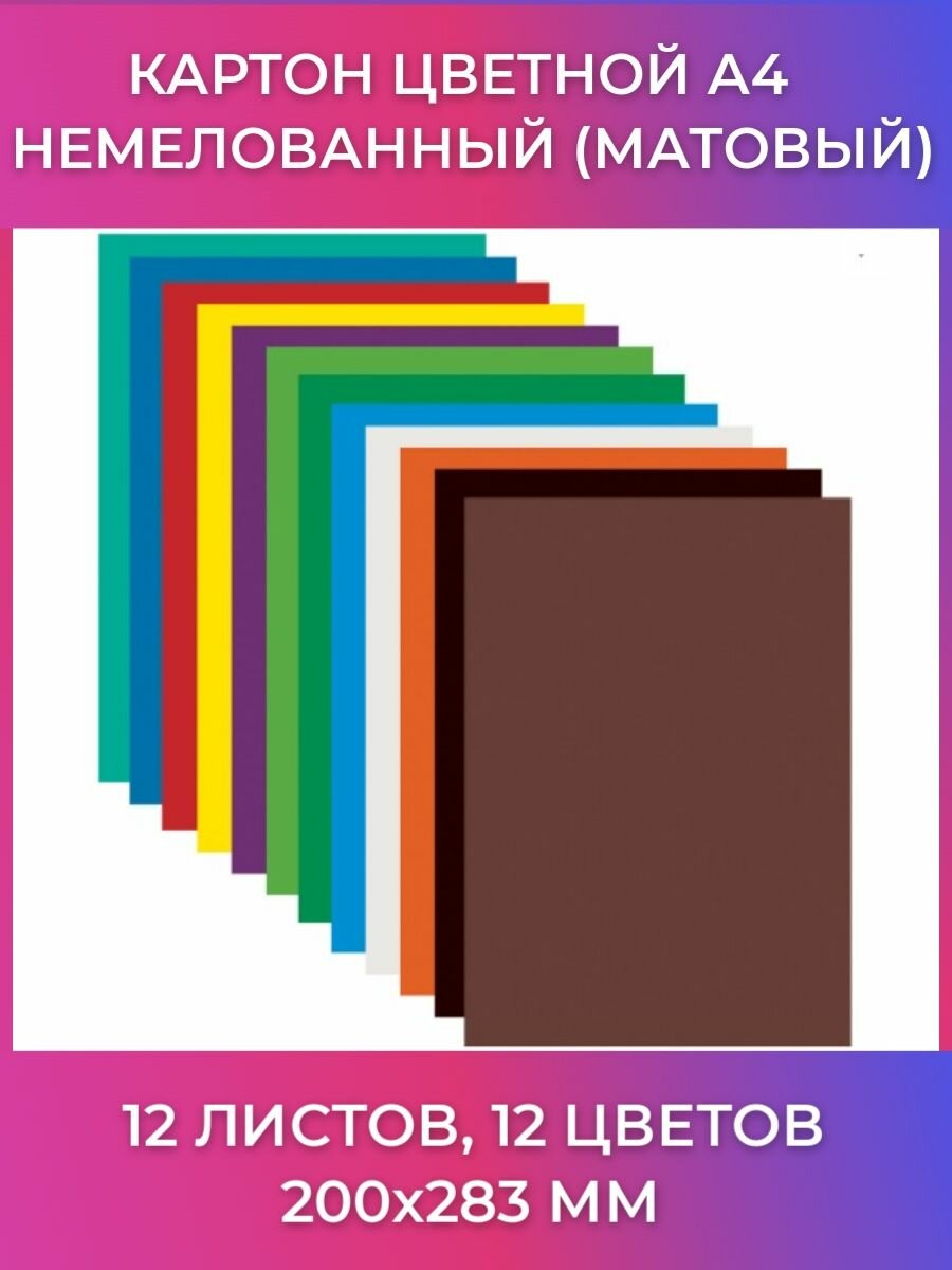 Картон цветной формата А4 для творчества немелованный (матовый), 12 листов 12 цветов, Пифагор, 200х283 мм, 128011