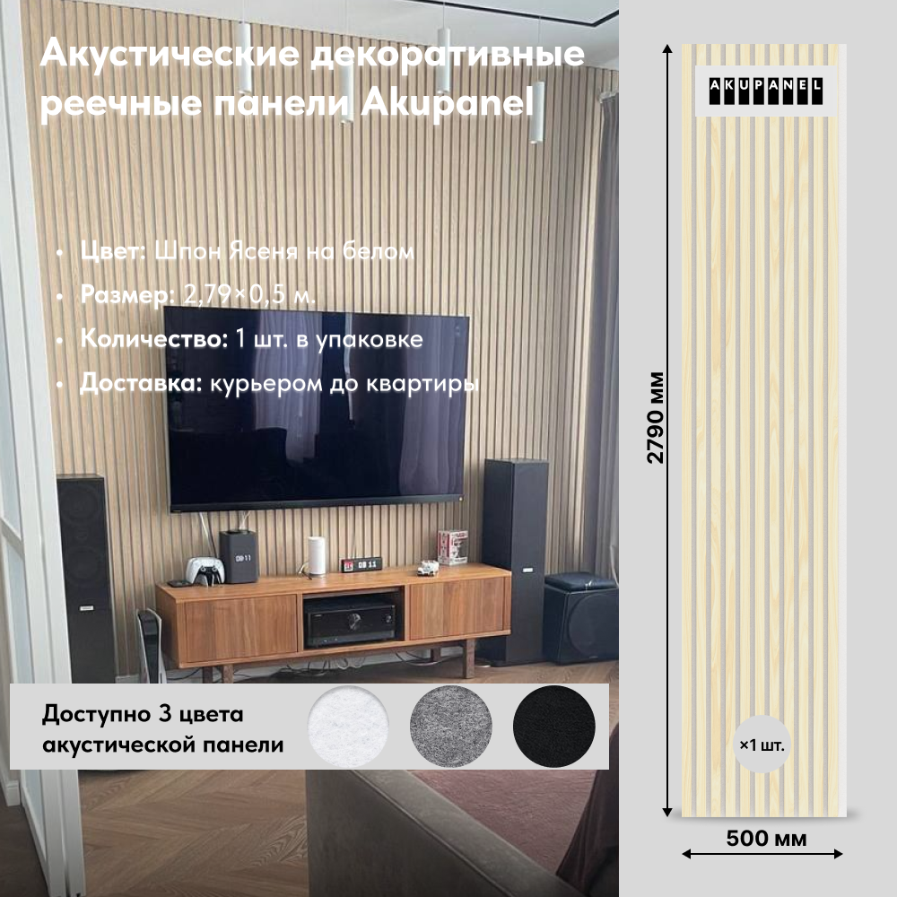 Купить Акупанель (Акустическая стеновая панель): декоративные рейки – Ясень шпон и Белая акустическая панель