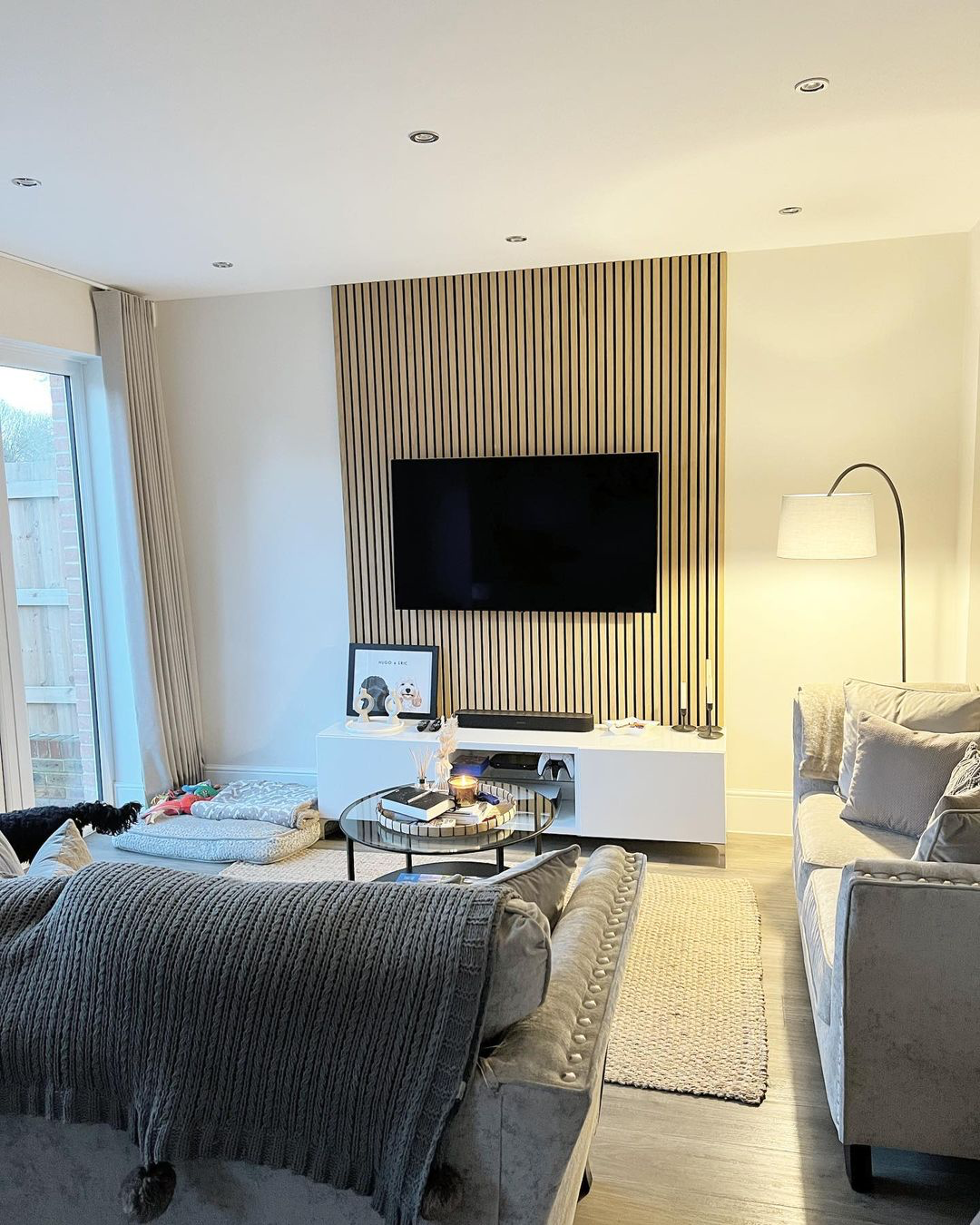 Акупанель (Акустическая стеновая панель): декоративные рейки – Ясень шпон и Серая акустическая панель
