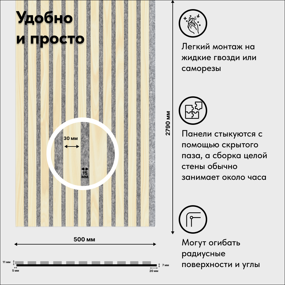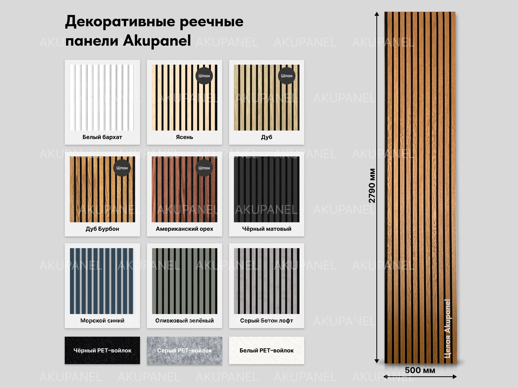 Акустическая реечная панель AKUPANEL - Декоративные рейки (Ясень Шпон) и серая акустическая панель Акупанель