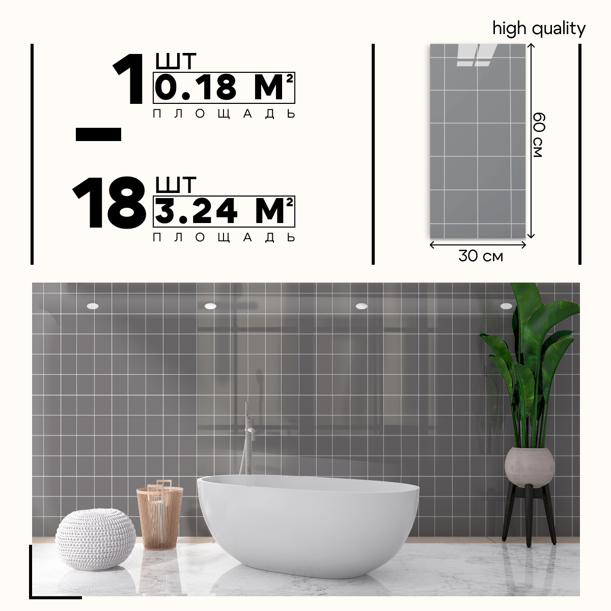 СохранитьСамоклеящиеся панели стеновые "Катри", Серая квадратная плитка, 30x60см, 18шт, 3.24м2 интересное: