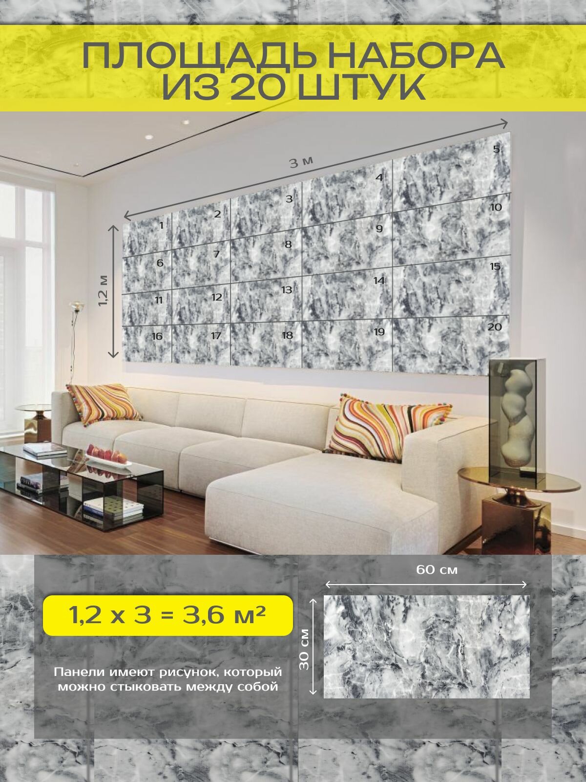 | Дополнительная информация | самоклеящиеся панели 60х30 см - комплект 20 шт. |