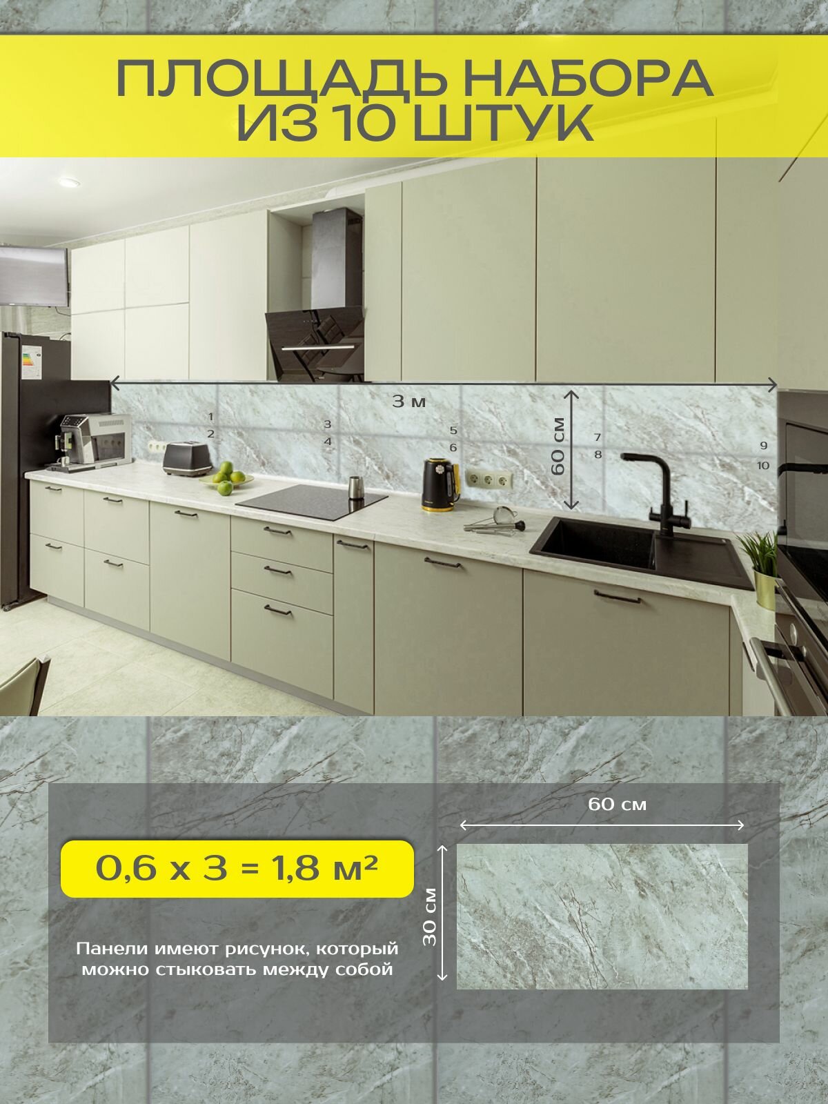 Фартук на стену для кухни. Плитки декоративные для дома на кухню, в ванную - панели 30х60 см ( комплект 10 шт), цвет: 020