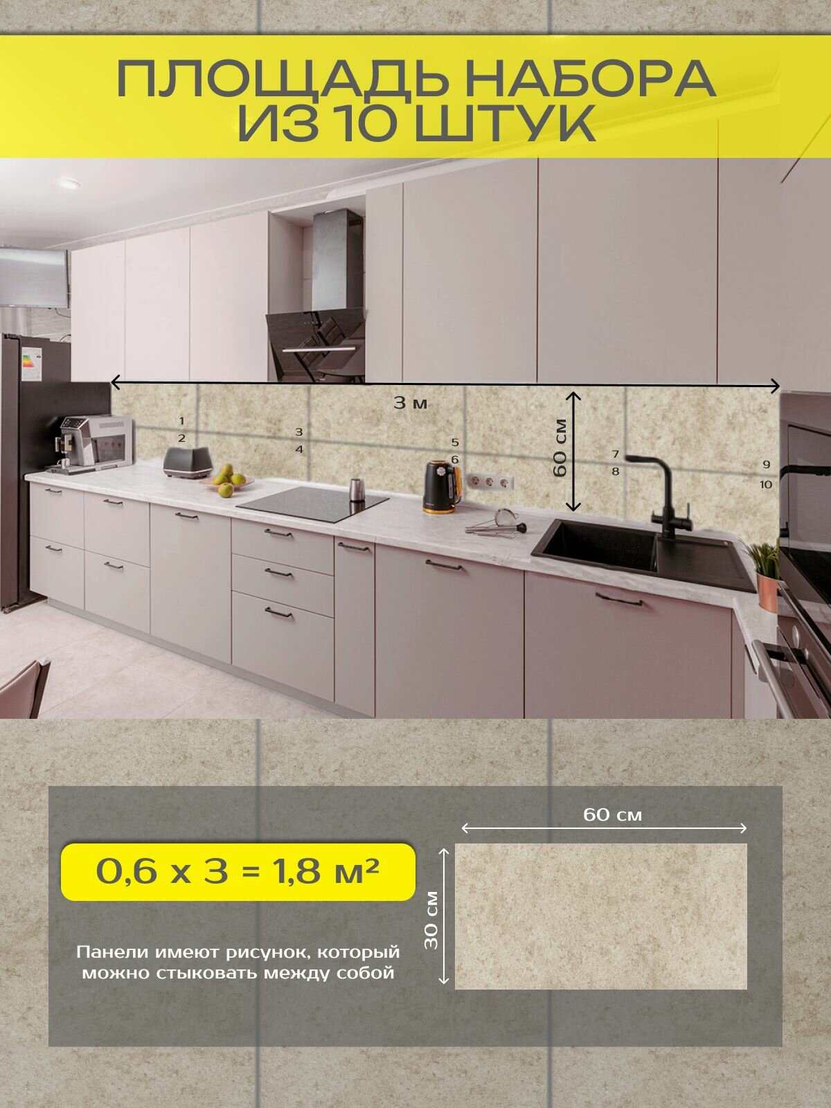 Фартук на стену для кухни. Плитки декоративные для дома на кухню, в ванную - панели 30х60 см ( комплект 10 шт), цвет: 020