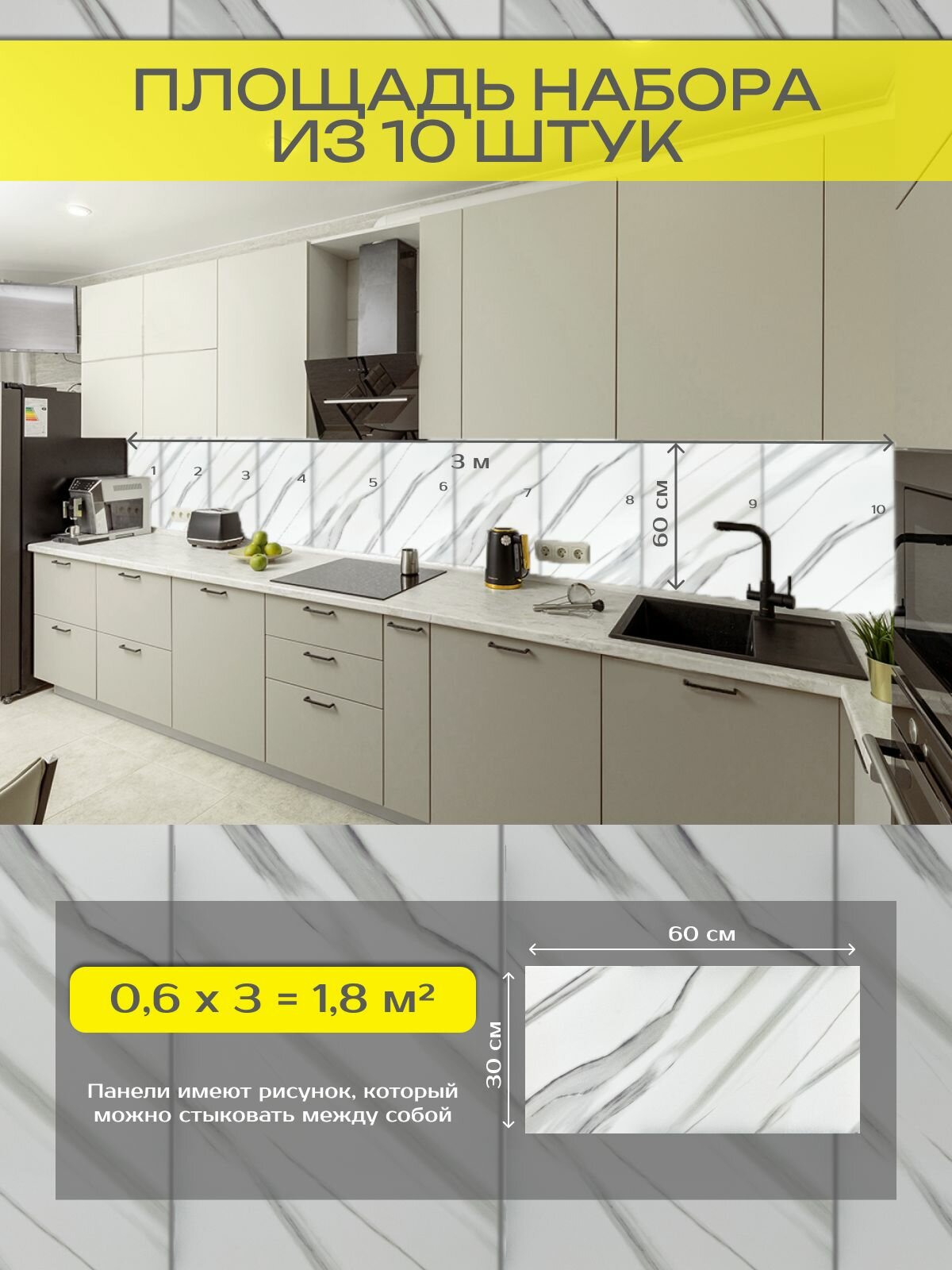 Фартук на стену для кухни. Плитки декоративные для дома на кухню, в ванную - панели 30х60 см ( комплект 10 шт), цвет: 020