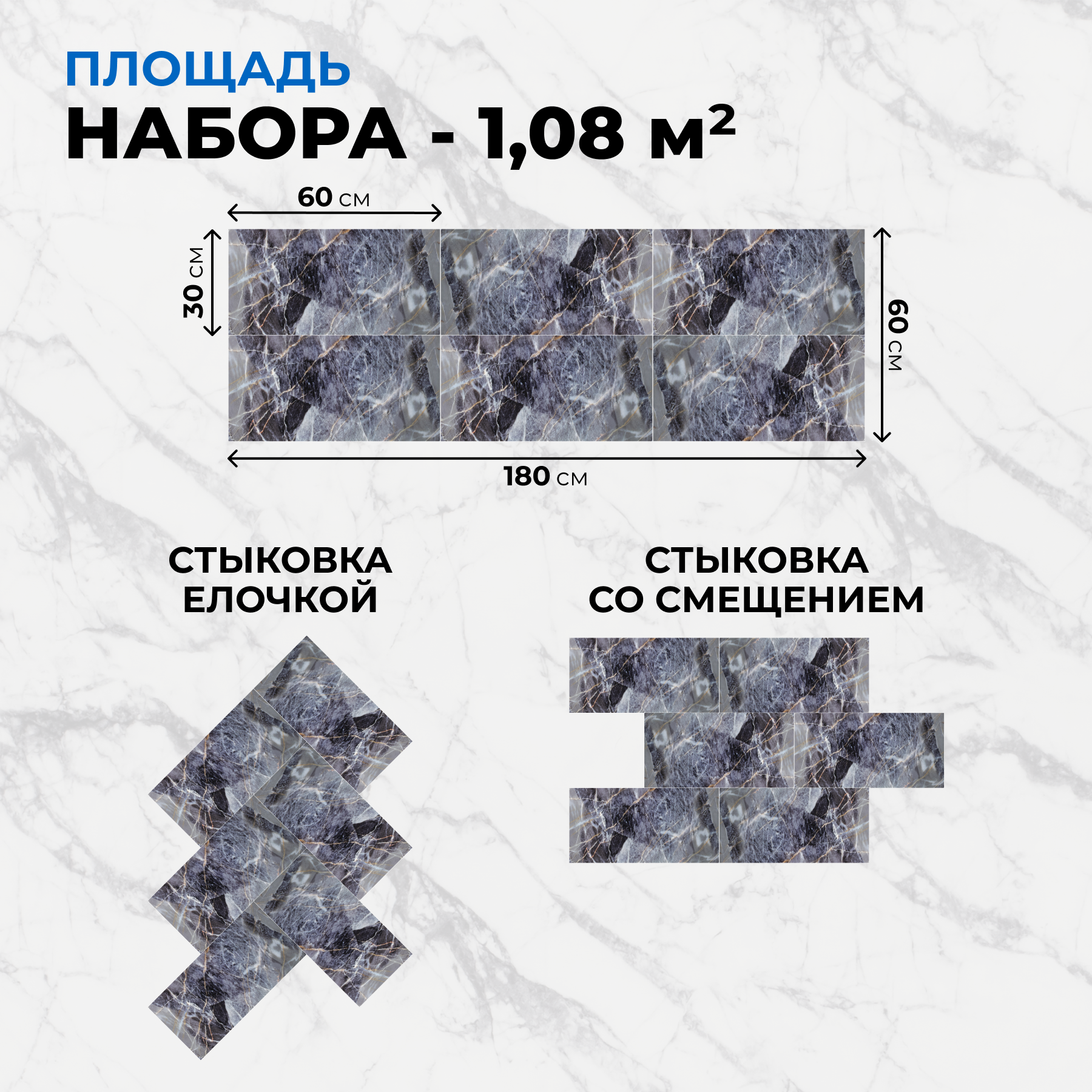 Темный мрамор, 60х30 см плитка глянцевая, самоклеющиеся панели для стен, декор для дома на кухню, в ванную (арт. 1019) 6 шт.