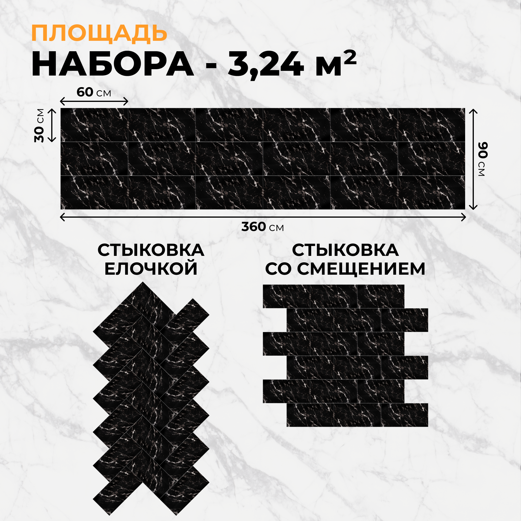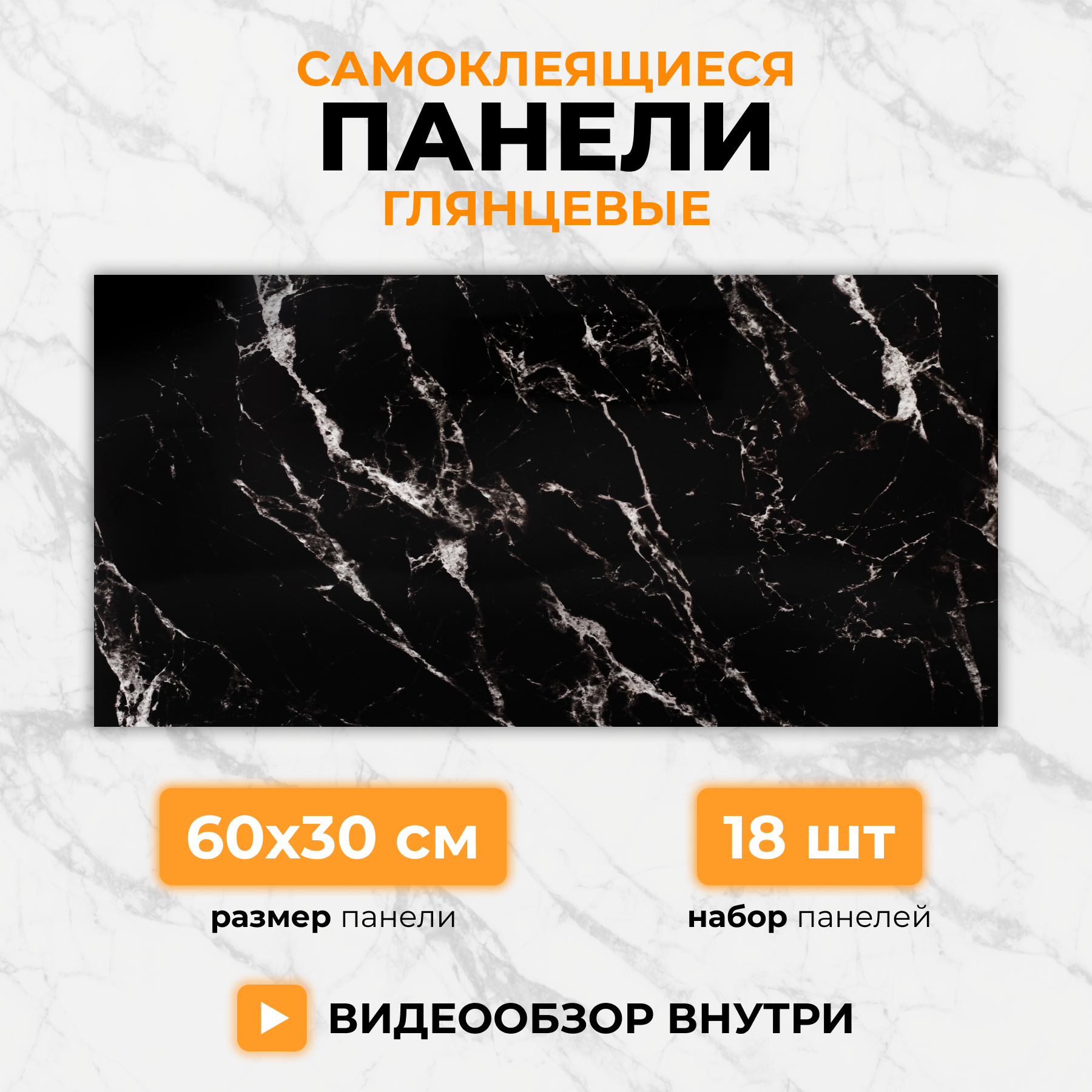 Купить Черный мрамор, 60х30 см плитка глянцевая, самоклеющиеся панели для стен, декор для дома на кухню, в ванную (арт. 114) 18 шт.