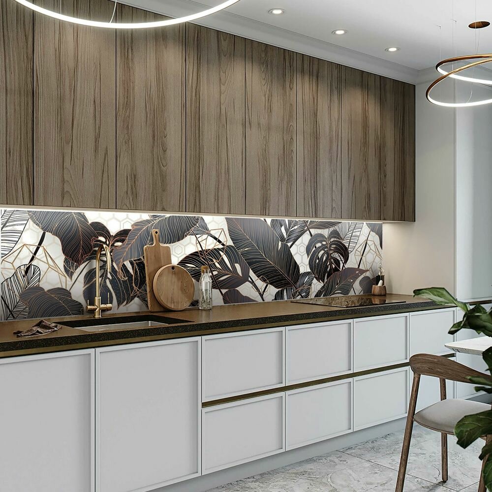 СохранитьФартук для кухни на стену 3000х600 мм, Листья в графике . Панель стеновая ПВХ влагостойкая декоративная интересное: