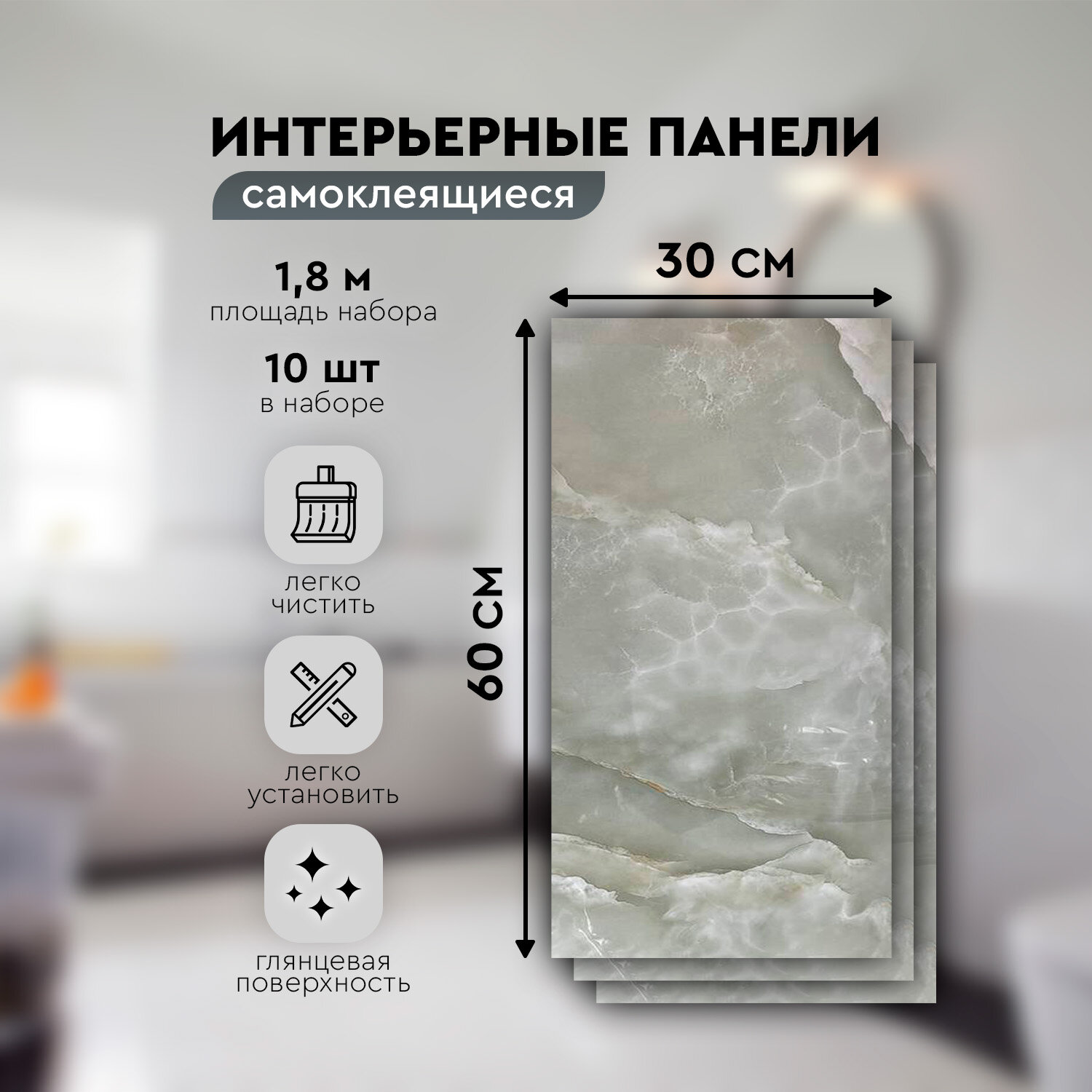 Панели самоклеящиеся для стен 30х60 см. 10 шт. мрамор серый
