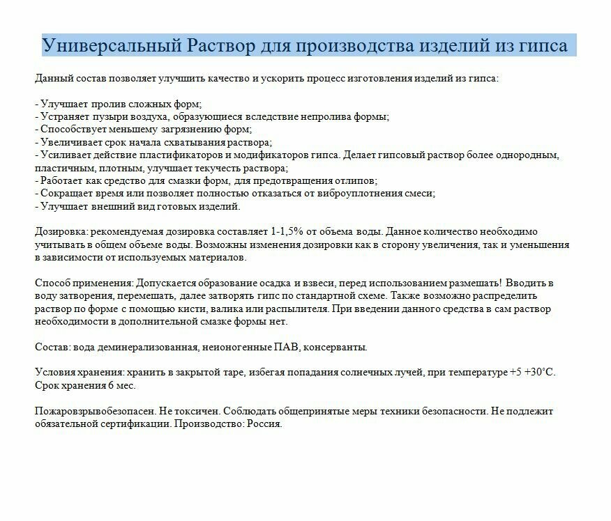 Купить Универсальный Раствор для производства изделий из гипса, 0,95 л