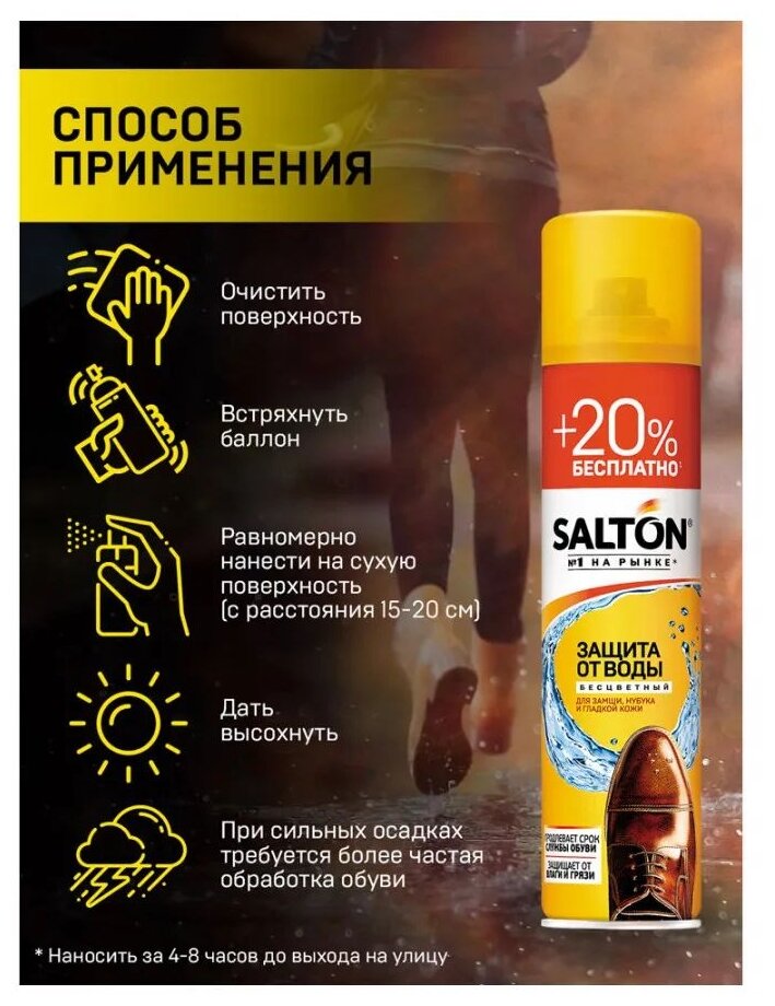 Защитой от воды Salton пользуюсь давно, обрабатываю кожаные ботинки, кроссовки замшевые, в общем всё, что ношу в межсезонье. Это очень удобно, что средство универсальное , подходит и для гладкой кожи, замши, нубука ещё и бесцветное, ко всем поверхностям подходит. Наношу на ночь, утром смело иду на улицу, не беспокоясь о сухости ног и сохранности самой обуви. Высыхает спрей достаточно быстро.
