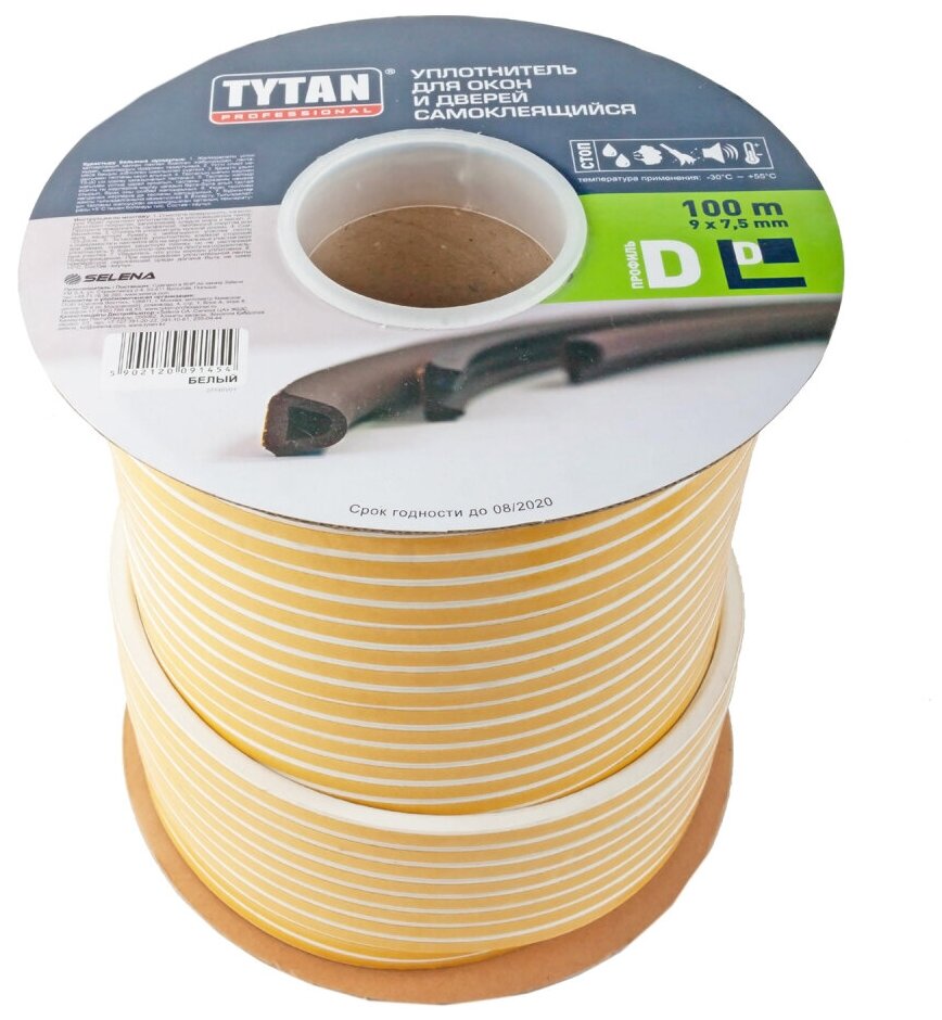 Уплотнитель для окон и дверей самоклеящийся TYTAN Professional D-профиль 9х7,5мм , 100м белый
