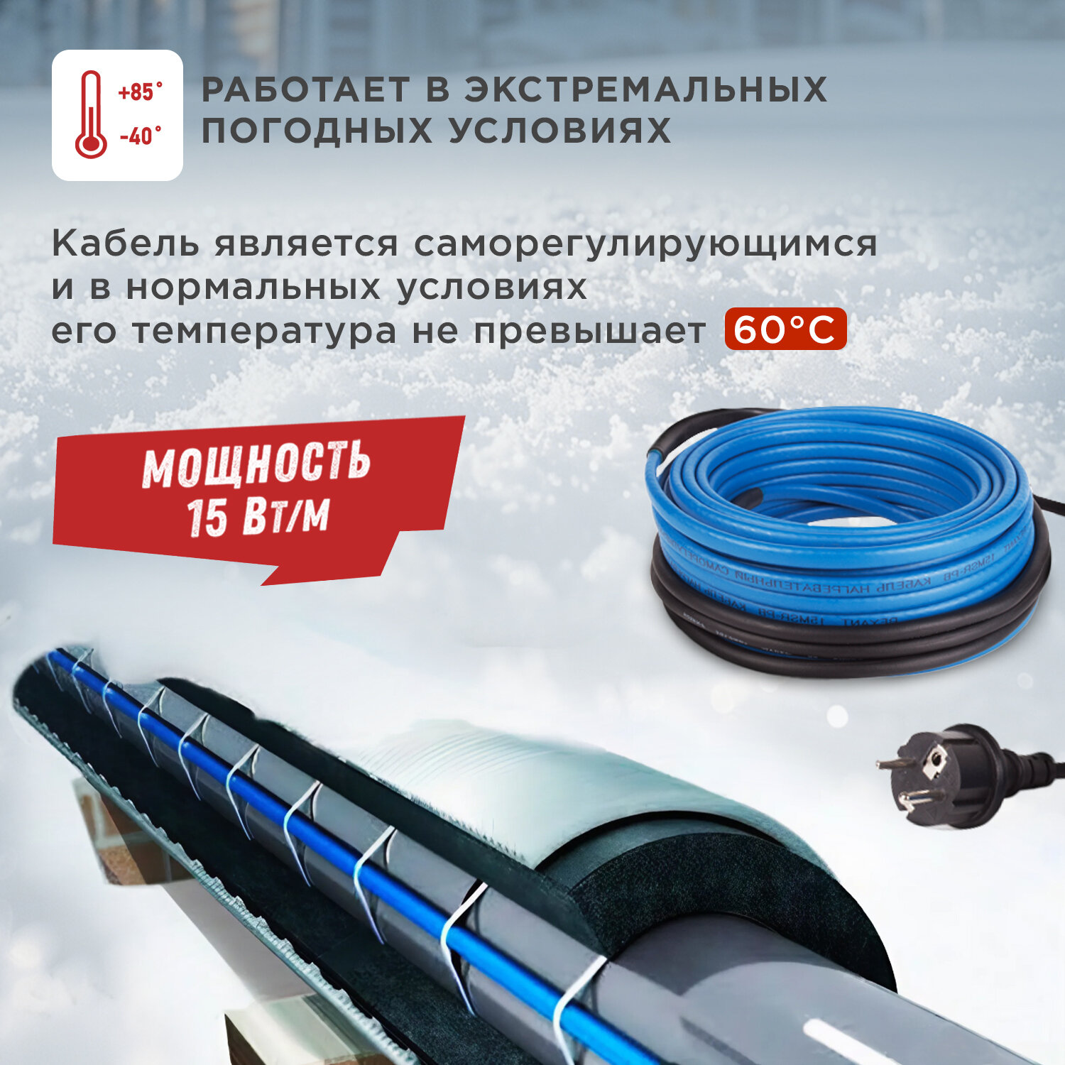 Комплект греющего кабеля REXANT 15 Вт/м с евровилкой для быстрой установки на трубу, 220 В, 15 м