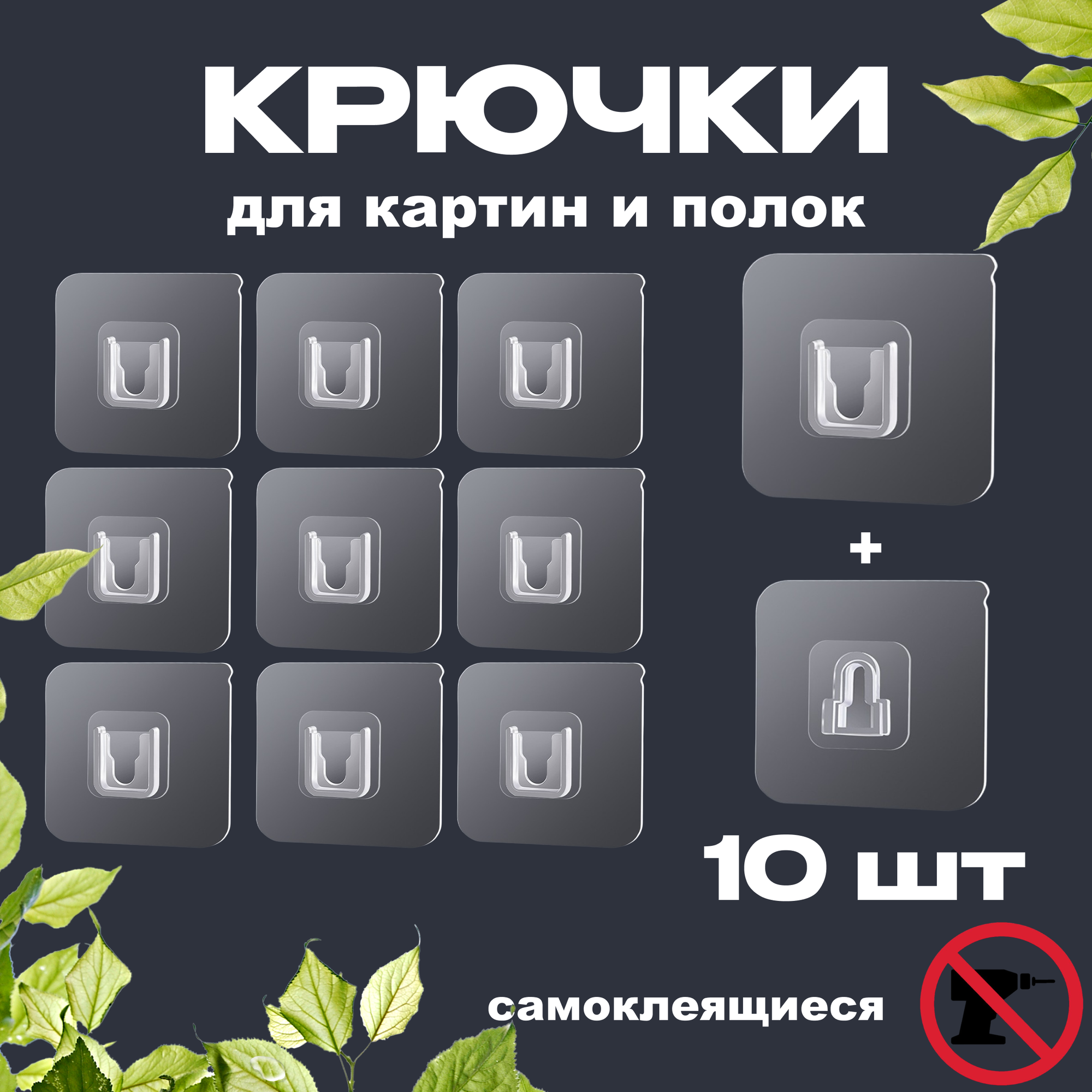Крючки самоклеящиеся для картин и полок, без сверления, нержавеющая сталь, 10 штук