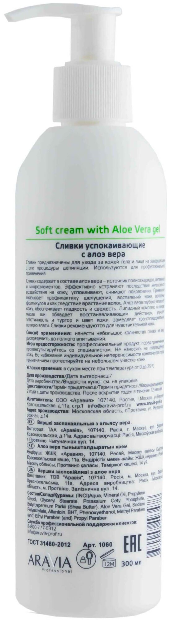 Сливки для тела ARAVIA PROFESSIONAL успокаивающие с алоэ вера, 300 мл
