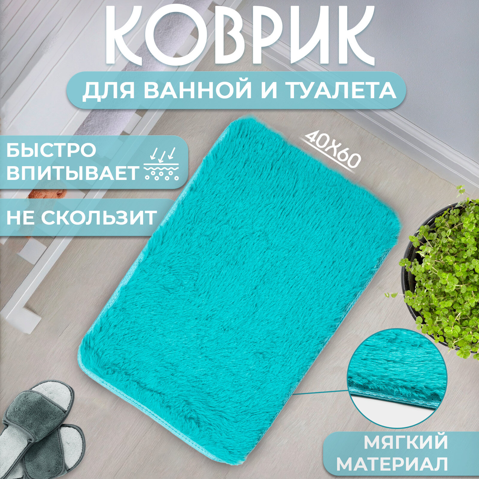 Коврик для ванной прямоугольный Доляна «Пушистик», 40×60 см, цвет лазурный