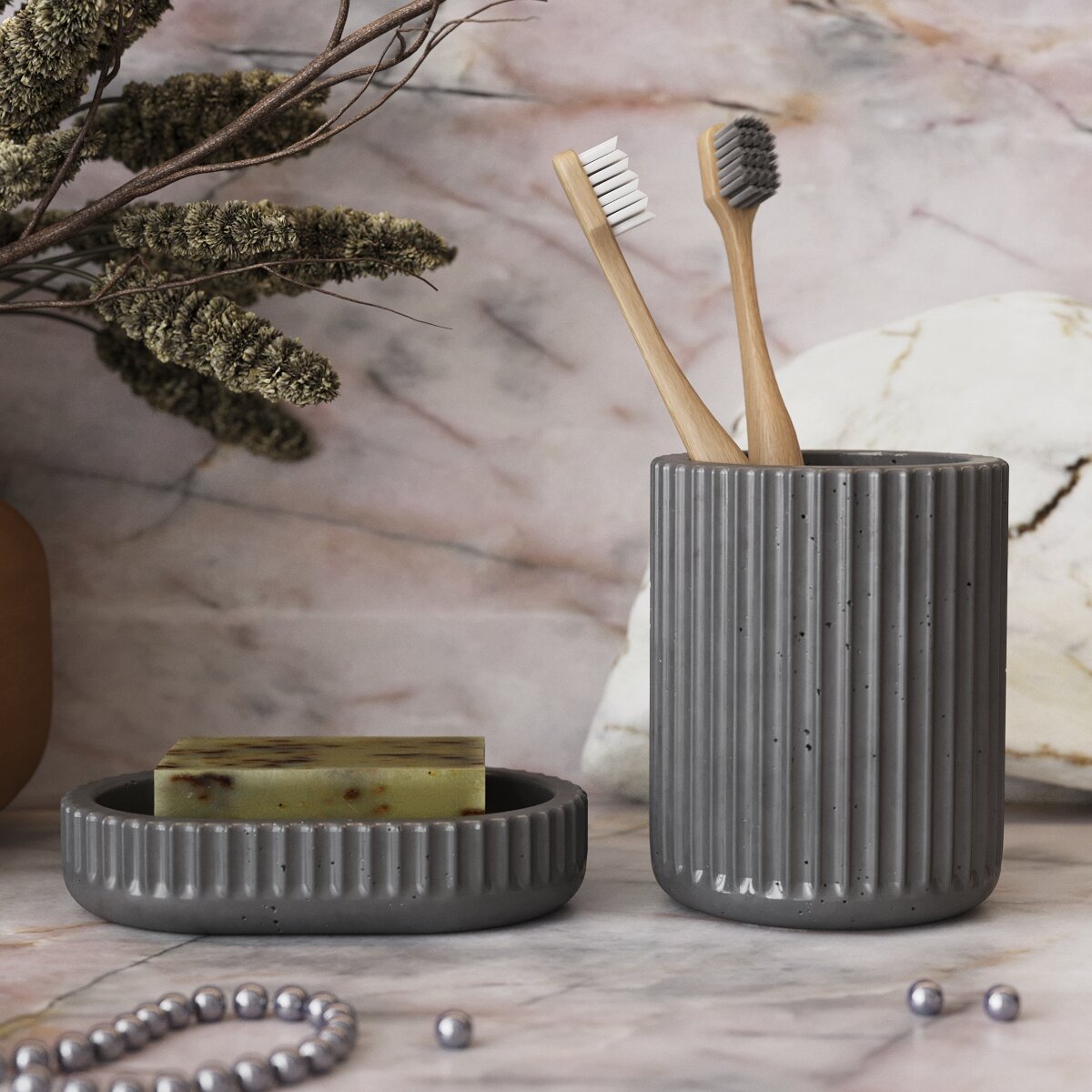 Набор для ванной комнаты Chloe 31 (мыльница для ванной и стакан для зубных щеток), бетон, графитовый матовый