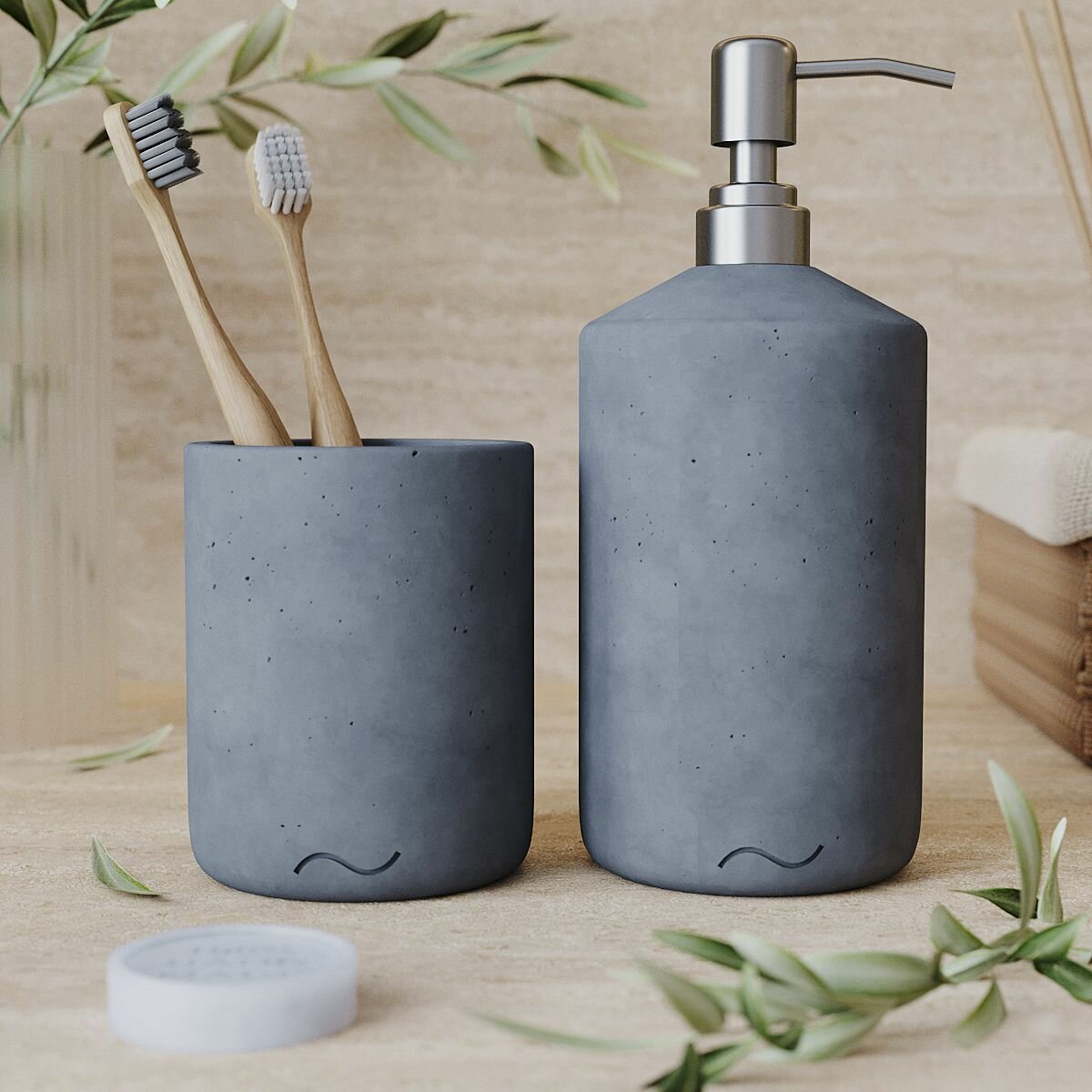 Набор для ванной комнаты Astrid 03 (стакан для щеток Astrid, дозатор Astrid для жидкого мыла с помпой металлик), бетон, графитовый глянцевый
