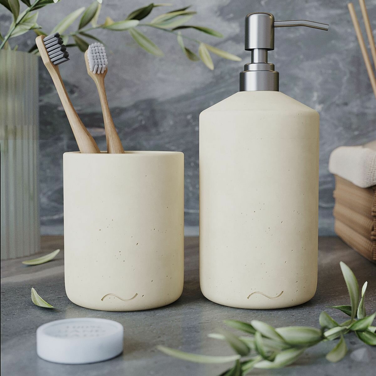 Набор для ванной комнаты Astrid 03 (стакан для щеток Astrid, дозатор Astrid для жидкого мыла с помпой металлик), бетон, кремовый глянцевый
