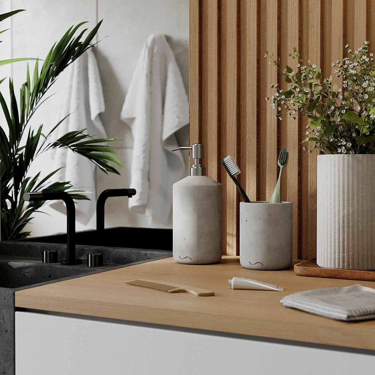 | Подробная комплектация | Дозатор для мыла с черной насадкой, 9x9х20,5 см, бетон - 1 шт. | Стакан для ванной, 9x9х11 см, бетон - 1 шт. | Комплект фетровых и силиконовых накладок |