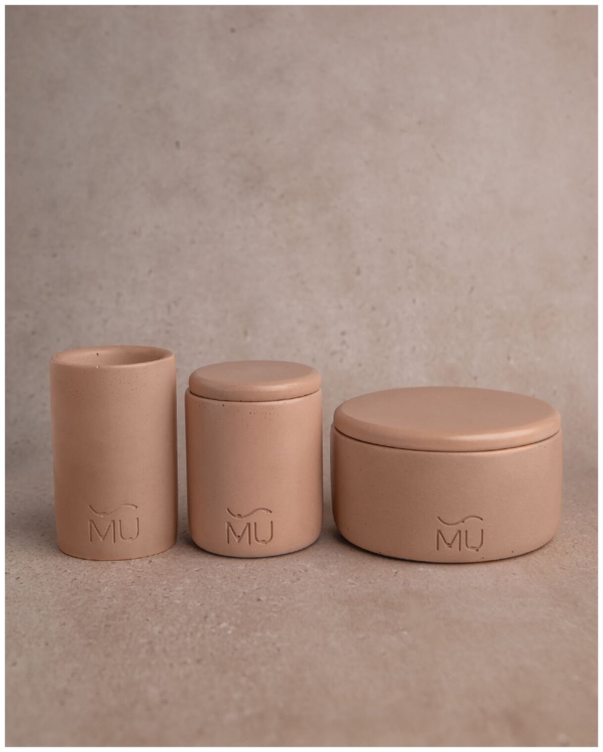Набор для ванной 06 (стакан для зубных щеток Leo, контейнер Ernest S с крышкой, емкость - органайзер Bella с крышкой), бетон, кремовый глянцевый