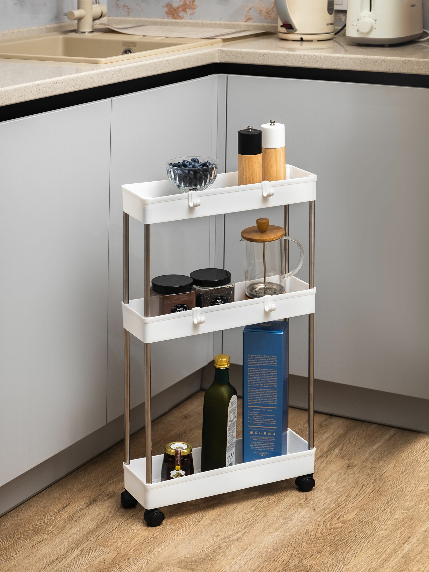 Этажерка органайзер GASTRORAG GR-750-3W узкая пластиковая, на колесиках в ванную