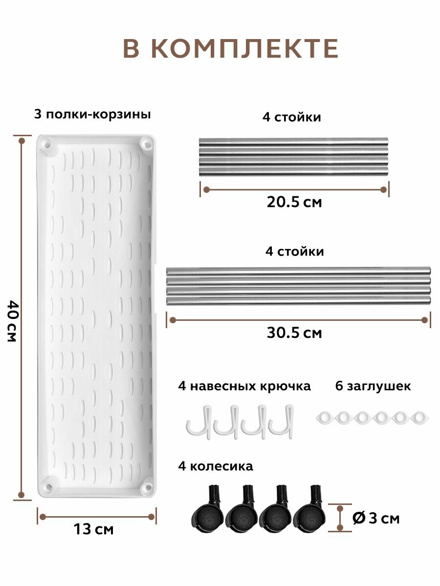 | Комплектация | Колеса - 4 шт;полка пластиковая - 3 шт;стойка из нержавеющей стали - 8 шт;крючок пластиковый - 4 шт;заглушка для стойки - 6 шт |
