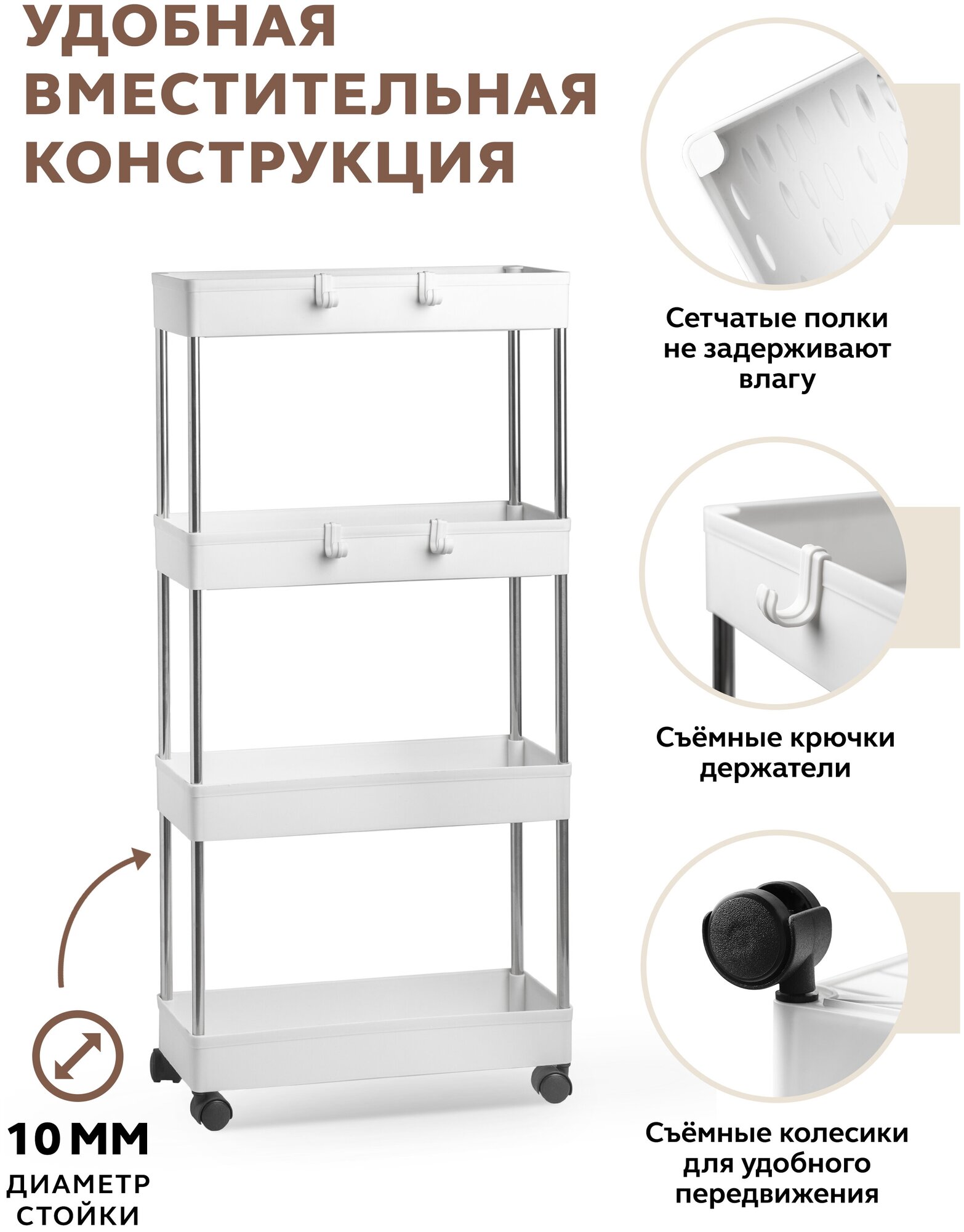 | Комплектация | Колеса - 4 шт; крючок пластиковый - 4 шт; стойка из нержавеющей стали - 12 шт; полка пластиковая - 4 шт; заглушка для стойки - 6 шт |