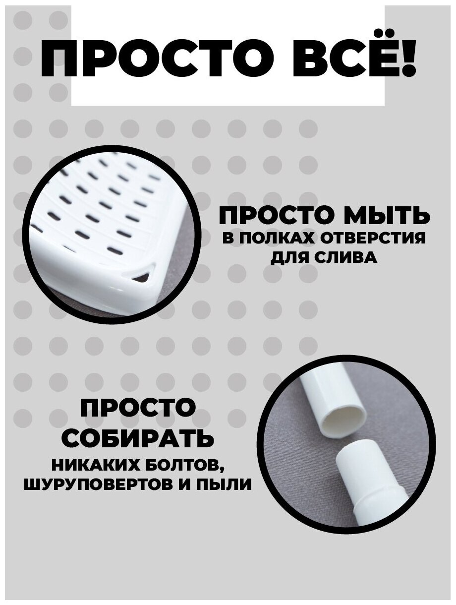 | Комплектация | 4 шт. полки, 4 шт. металлические трубки, 6 шт. водонепроницаемых креплений, 6 шт. пластиковых креплений. |