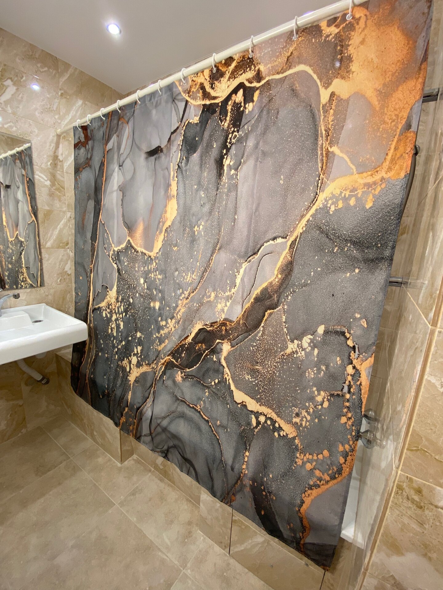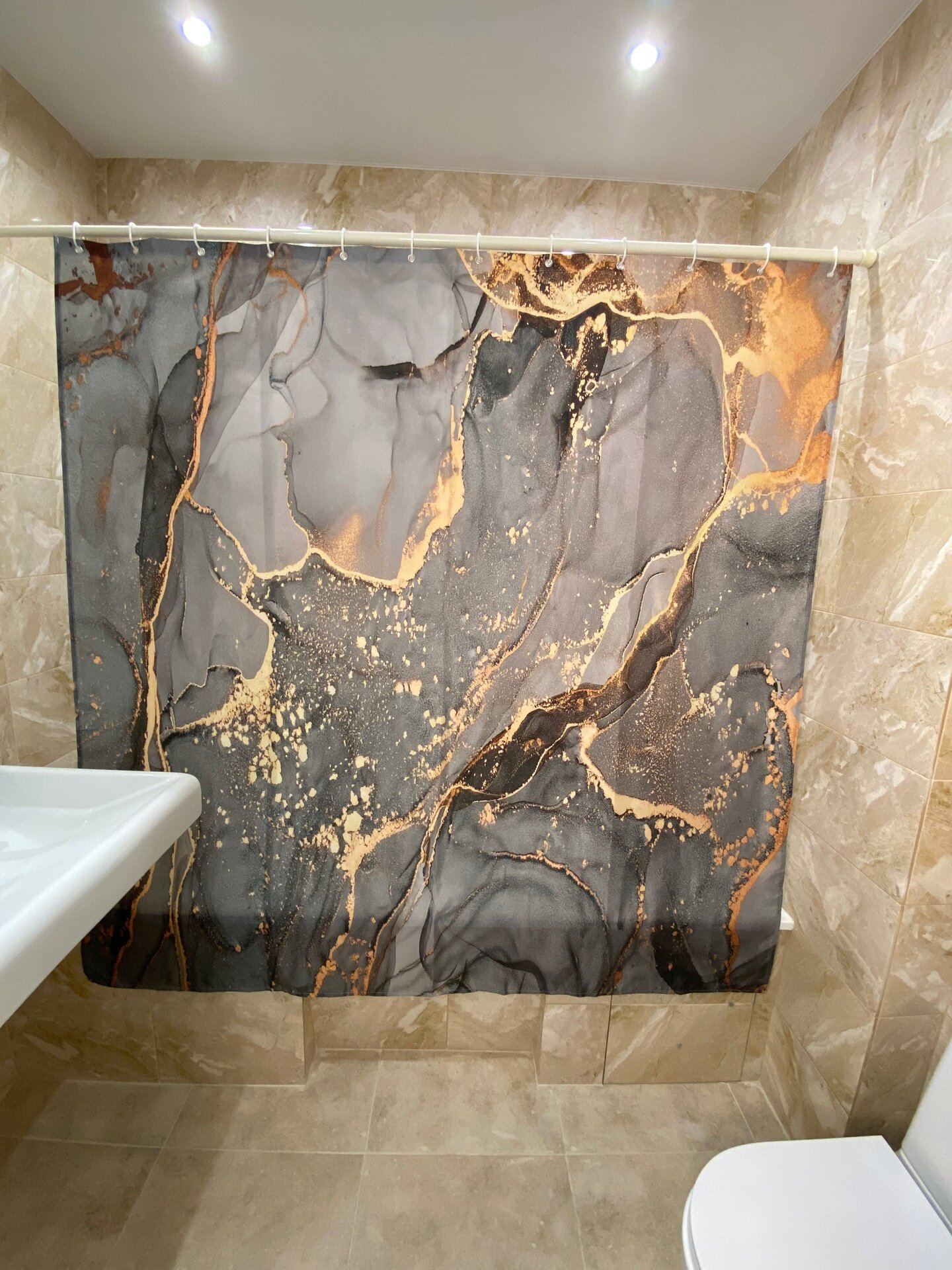 СохранитьШтора для ванной тканевая с рисунком серый мрамор интересное:
