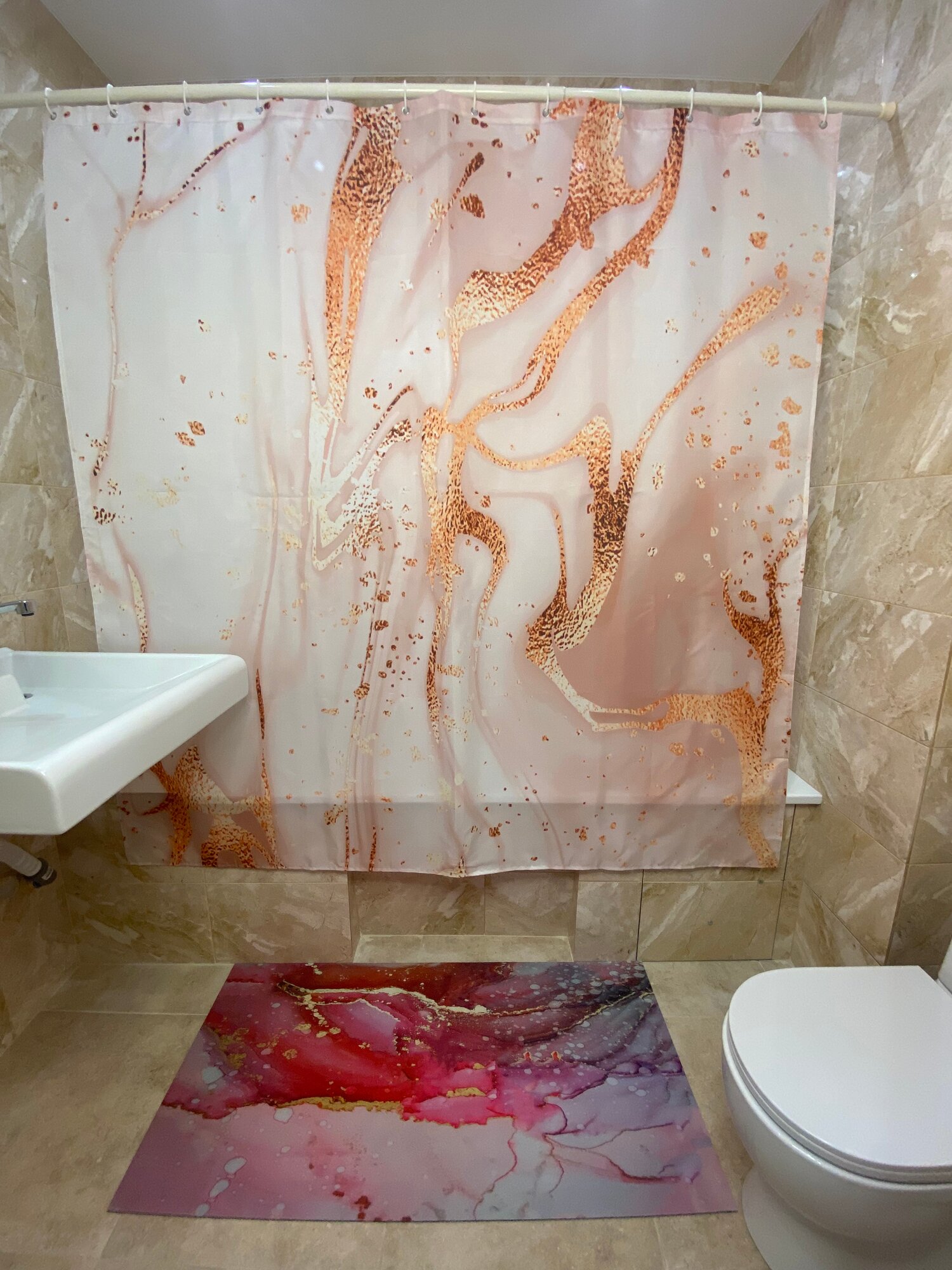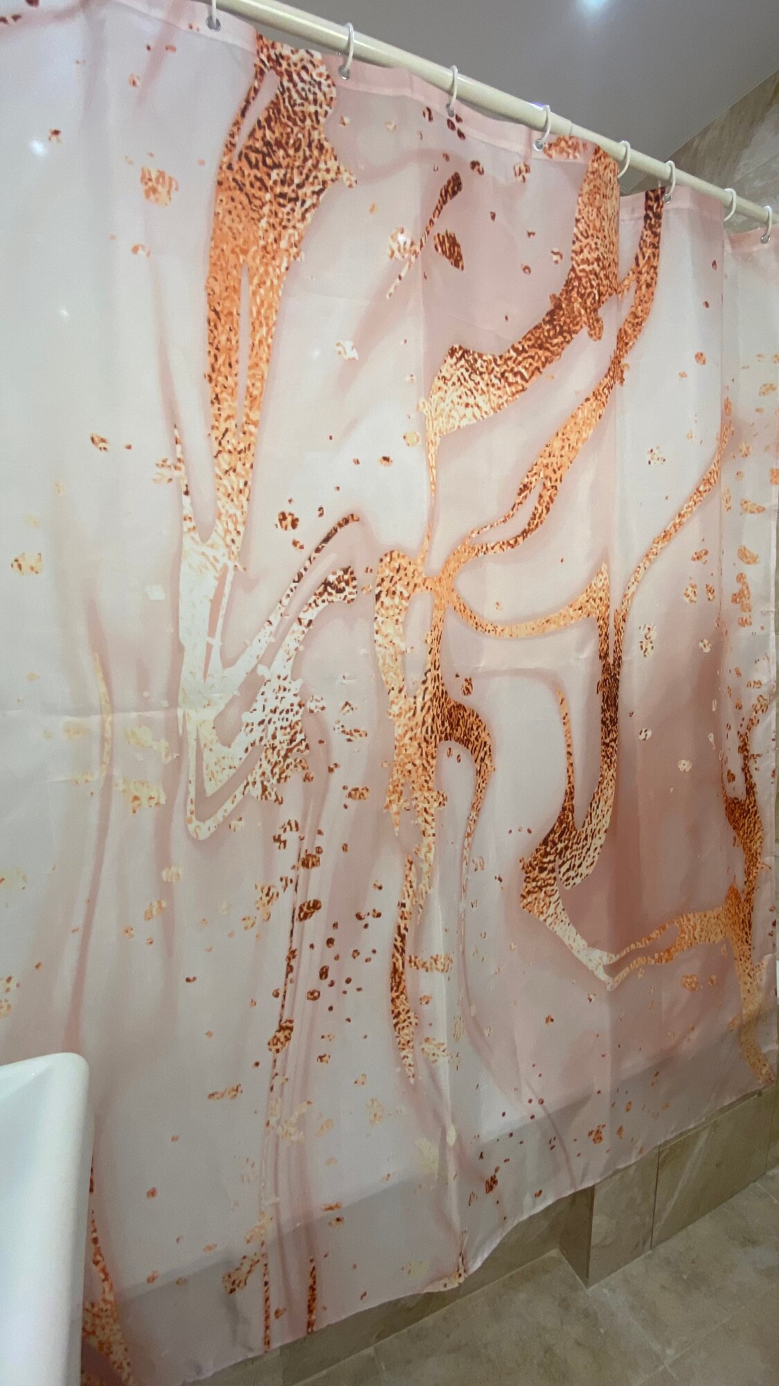 СохранитьШтора для ванной тканевая с рисунком розовый мрамор интересное: