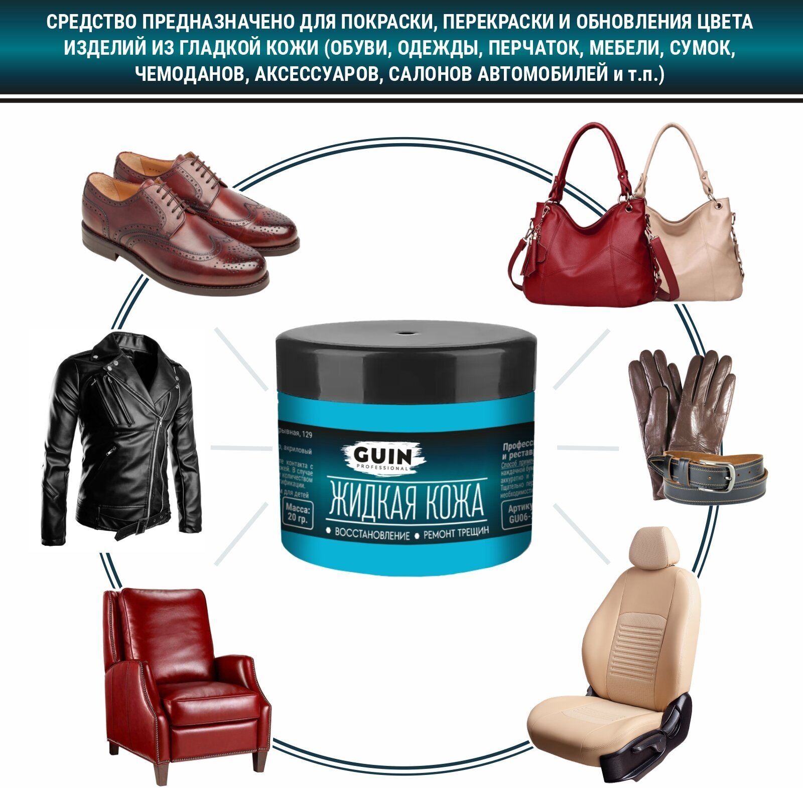 Жидкая кожа GUIN 20 гр Чёрный, восстановитель для ремонта обуви, сумок, авто, мебели, кожаных изделий, крем-краситель