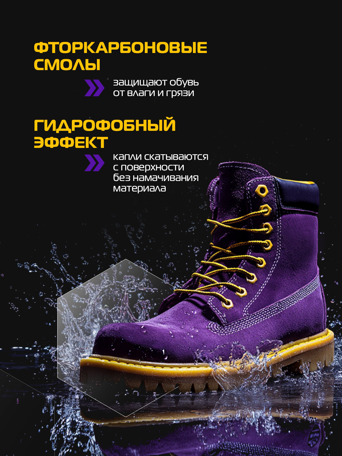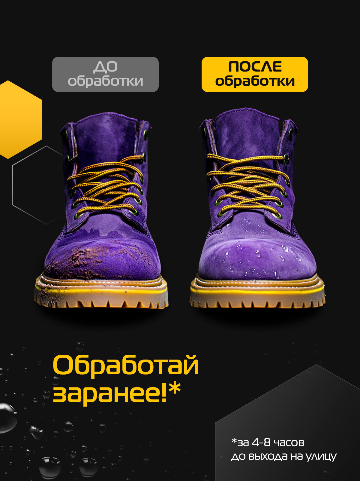 | Дополнительная информация | очистить поверхность, встряхнуть баллон, равномерно нанести на сухую поверхность (с расстояния 15-20 см), дать высохнуть, при сильных осадках требуется более частая обработка обуви; наносить за 4-8 часов до выхода на улицу. |
