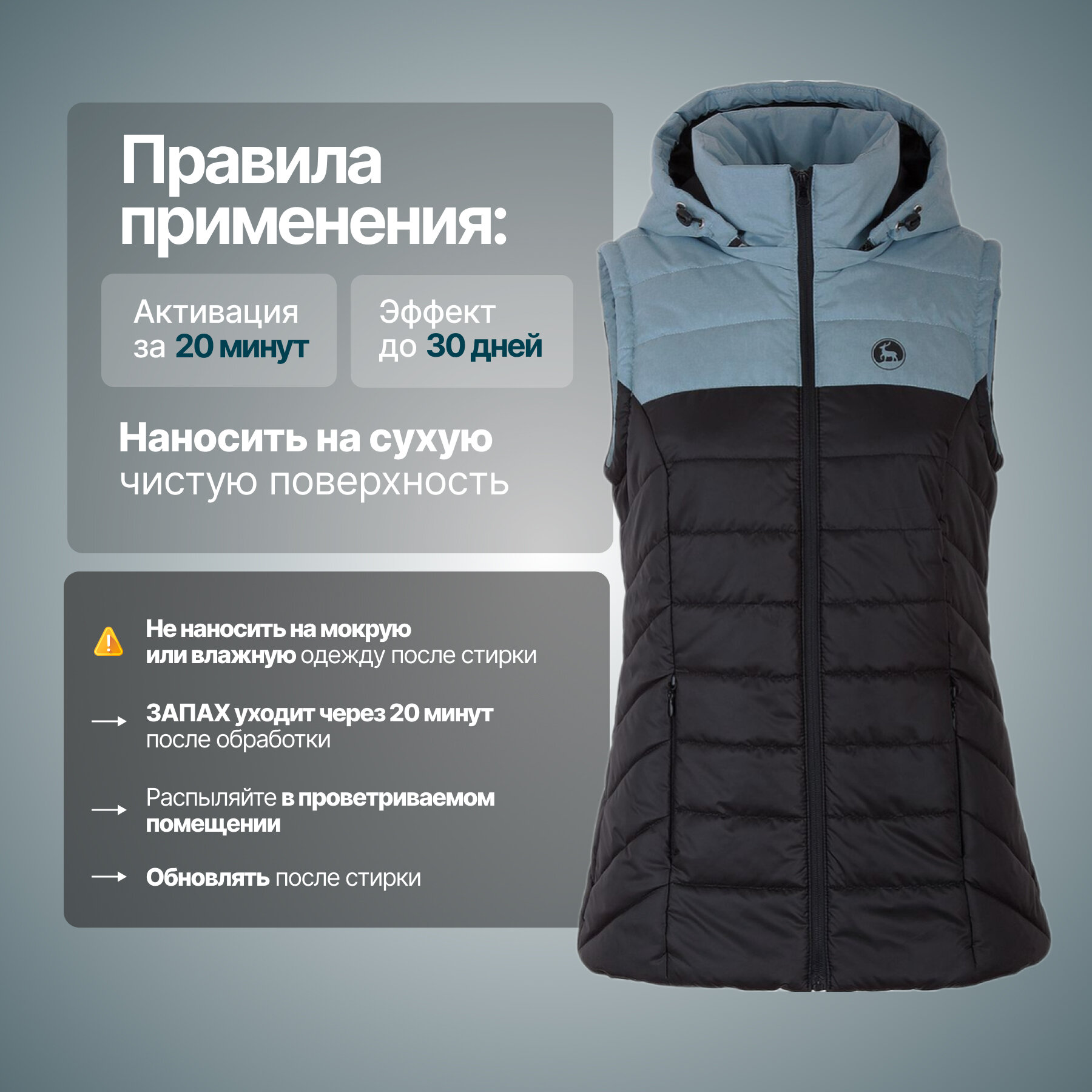 | Дополнительная информация | состав: зопропиловый спирт, бутилацетат, фторированный акриловый сополимер, диоксид кремния; 1 флакона достаточно для обработки 2-3 курток |