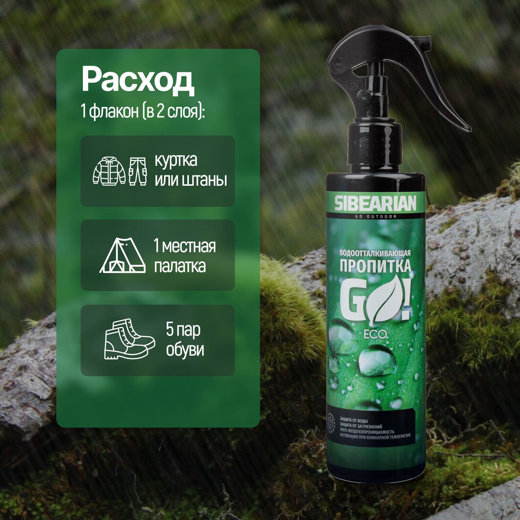 Водоотталкивающий спрей для одежды, обуви и снаряжения на водной основе без запаха, водоотталкивающая пропитка для палатки и снаряжения SIBEARIAN GO! ECO 250 мл 2 шт набор