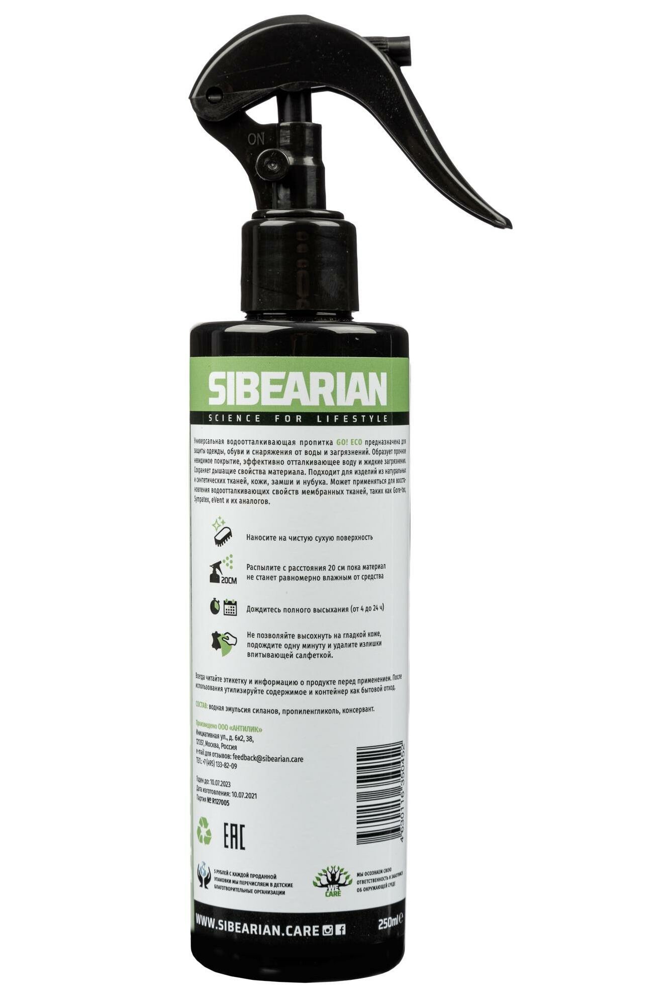 Водоотталкивающий спрей для одежды без запаха, пропитка для одежды из текстиля, для кожи, текстиля мембраны SIBEARIAN GO! Eco 250мл