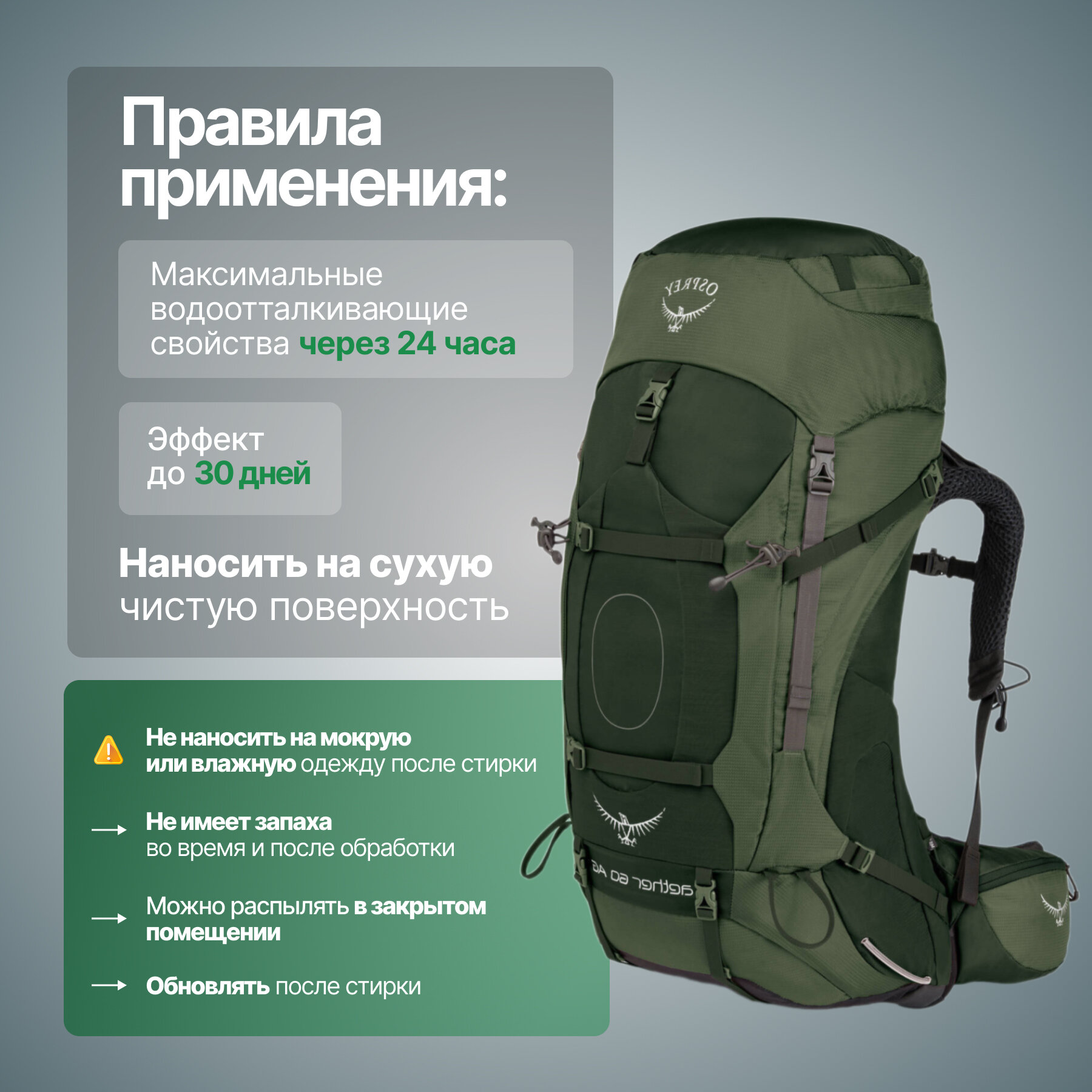 | Дополнительная информация | состав: зопропиловый спирт, бутилацетат, фторированный акриловый сополимер, диоксид кремния; 1 флакона достаточно для обработки 2-3 курток |