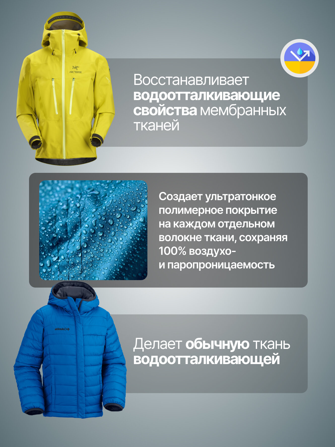 | Дополнительная информация | состав: зопропиловый спирт, бутилацетат, фторированный акриловый сополимер, диоксид кремния; 1 флакона достаточно для обработки 2-3 курток |