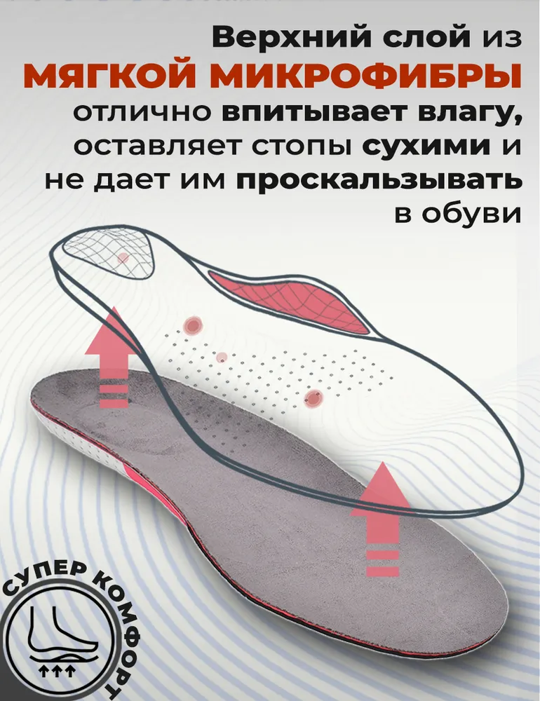 | Дополнительная информация | анатомические стельки для спортивной и туристической обуви. Фиксируют стопу и поддерживают ее свод в правильном положении, уменьшая статические и динамические нагрузки на суставы опорно-двигательного аппарата. Верхнее покрытие из мягкой микрофибры отлично впитывает влагу, оставляя стопы сухими, не давая им проскальзывать, даря чувство комфорта. Плотный войлочный слой сохраняет постоянный воздухообмен в обуви. Гелевый супинатор в пяточной зоне и основа из упругого EVA-материала защищают стопу от ударной нагрузки при занятиях спортом |