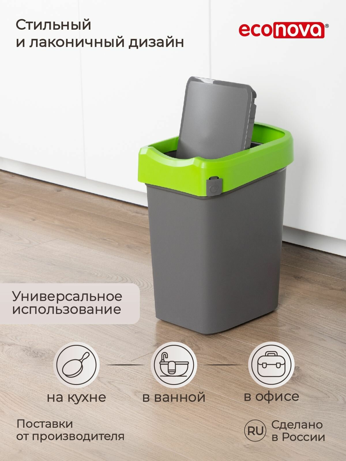 Мусорное ведро 25 литров Econova для кухни, туалета, офиса, с крышкой, напольный контейнер для хранения мусора, пластиковый, узкий, прямоугольный (серый)