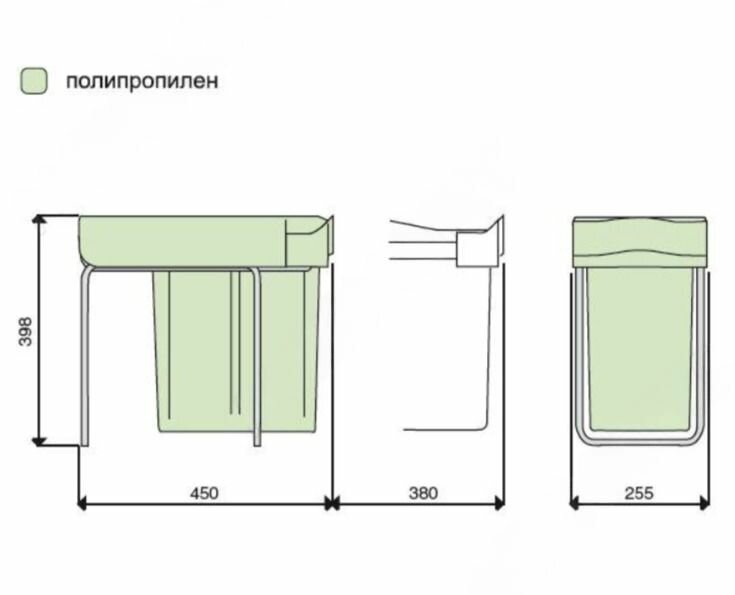 | Комплектация | корпус ведра (1 шт.), съемное ведро объемом 20 л (1 шт.), разделитель ведра (1шт), крышка (1 шт.), крепление к каркасу (1 комплект.), крепление к фасаду (1 комплект.), шуруп Ø4 x 20 мм (10 шт.), шаблон присадки (1 шт.) |