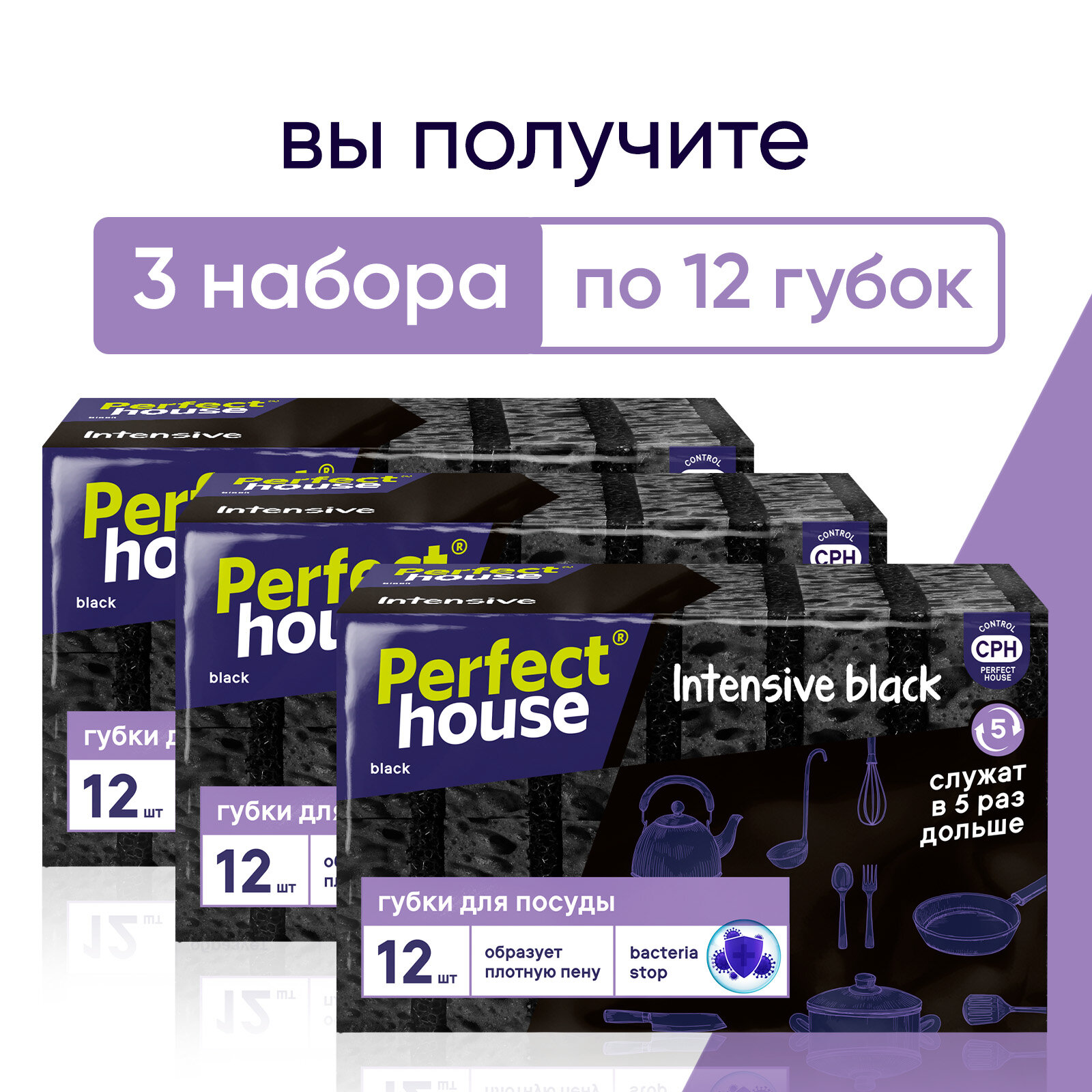 Купить Губки для мытья посуды Perfect House Intensive black черные хозяйственные для уборки на кухне, 36 шт
