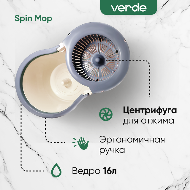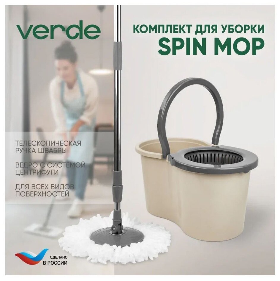 Швабра с отжимом и ведром, комплект для уборки VERDE SPIN MOP бежевый интересное: