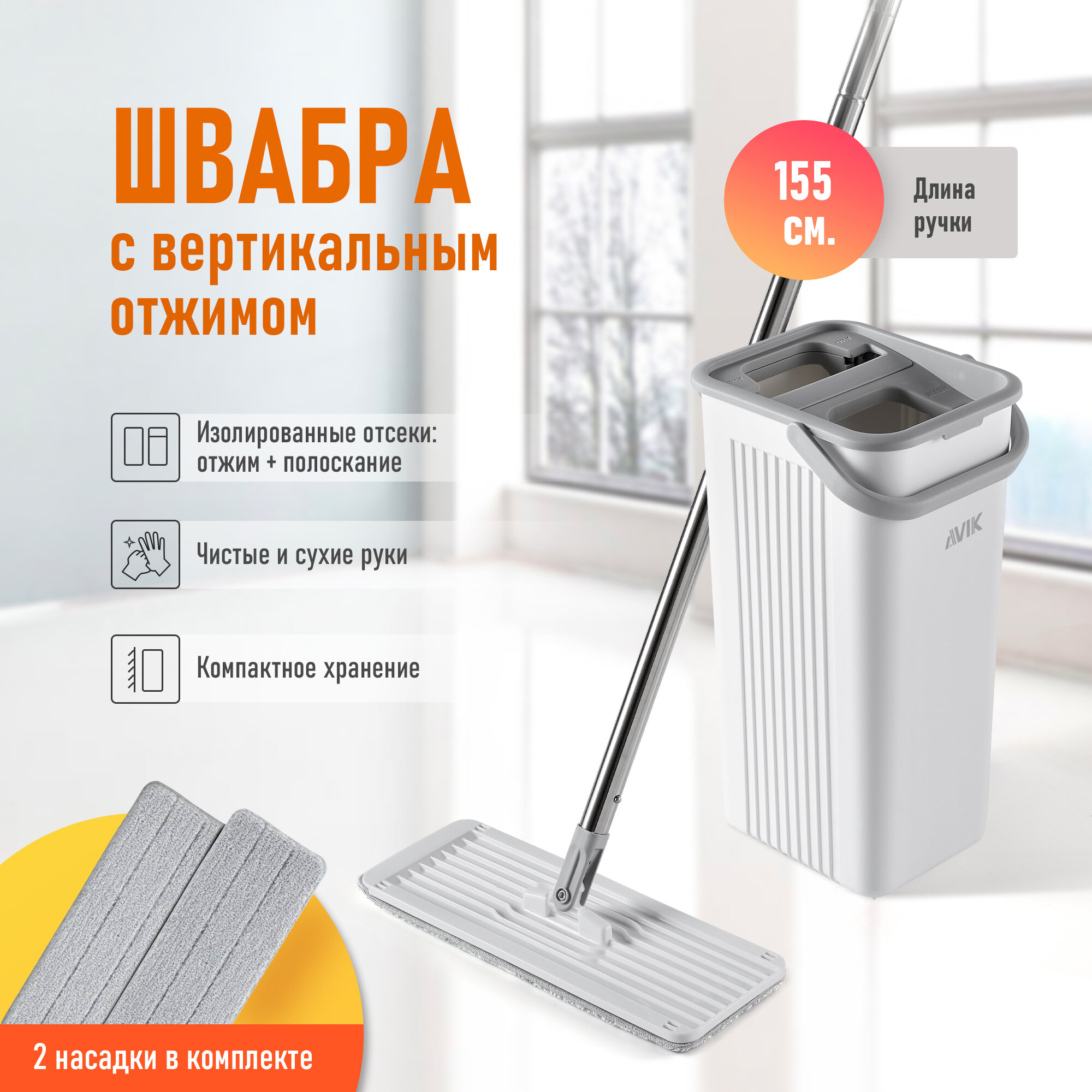 Комплект для уборки AVIK: швабра с отжимом и ведром для мытья полов и окон/ швабра с вертикальным отжимом / швабра лентяйка (9 литров) интересное: